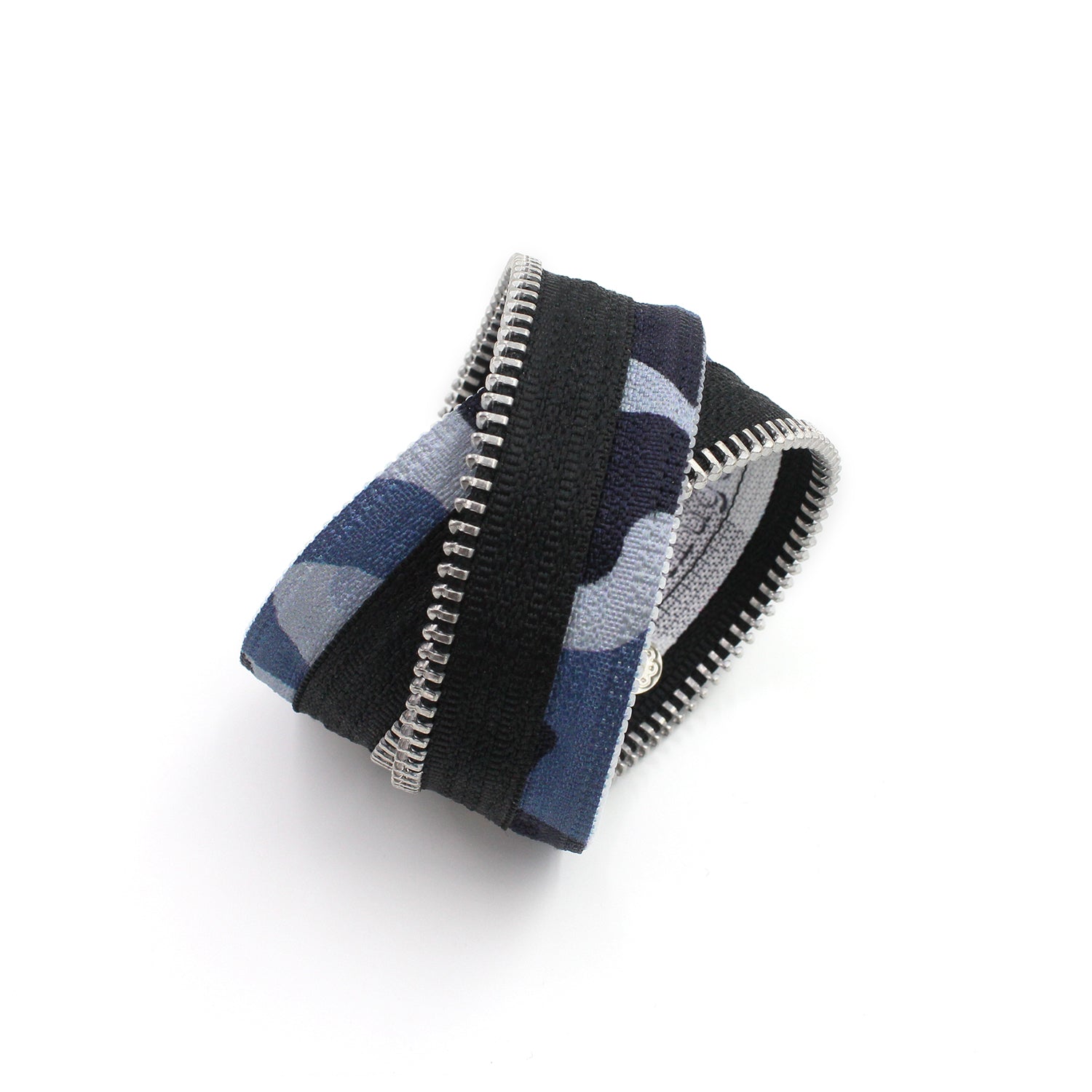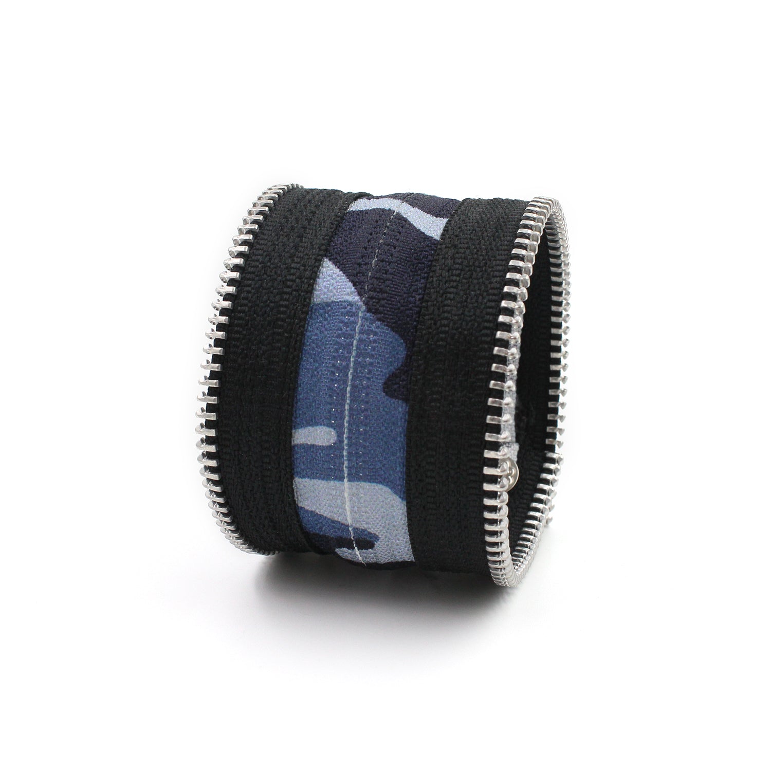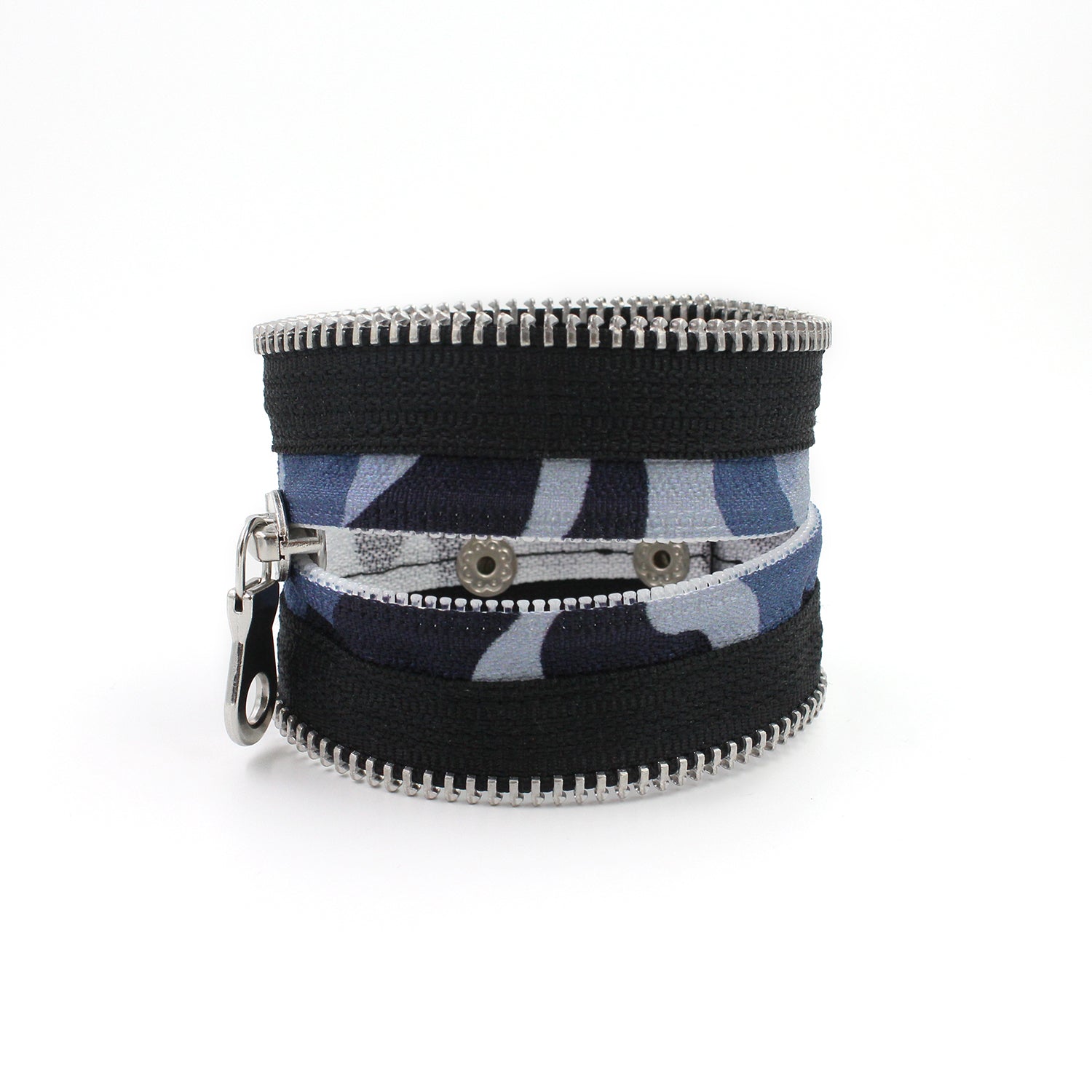 $20.00 USD$0.00 USDAvailable: Out Of Stock :-(Blend-in blue on blue camouflage zipper bracelet. Blue camouflage inner zipper with clear teeth. Blue outer zipper with nickel teeth. Navy topstitch. Nickel snaps. Nickel zipper pull. Wear it 3 Ways: Closed, Open & Twisted! Bracelet width: 1.75" Size: Adjustable 2 ways - 7.25" and 8" (Medium to Large)