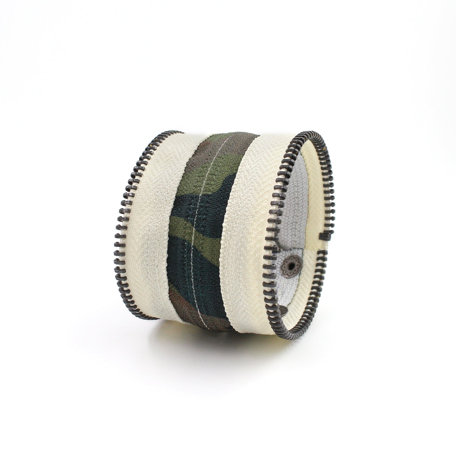 $20.00 USD$0.00 USDAvailable: Out Of Stock :-(Classy camouflage zipper bracelet. Dark green camouflage inner zipper with clear teeth. Cream outer zipper with gunmetal teeth. cream topstitch. Gunmetal snaps. Nickel zipper pull. Bracelet width: 1.75" Size: Adjustable 2 ways - 7" and 8" (Small to Large)