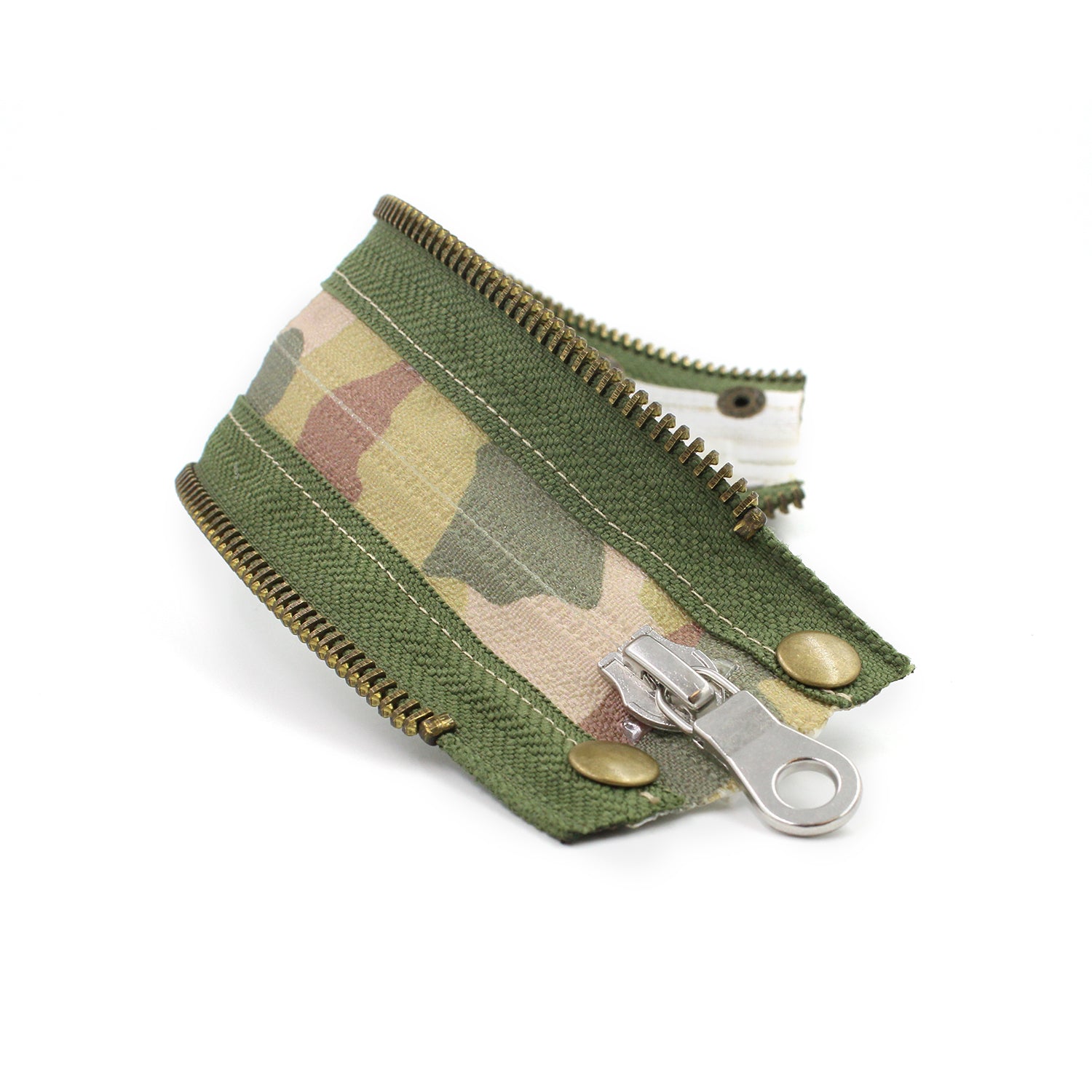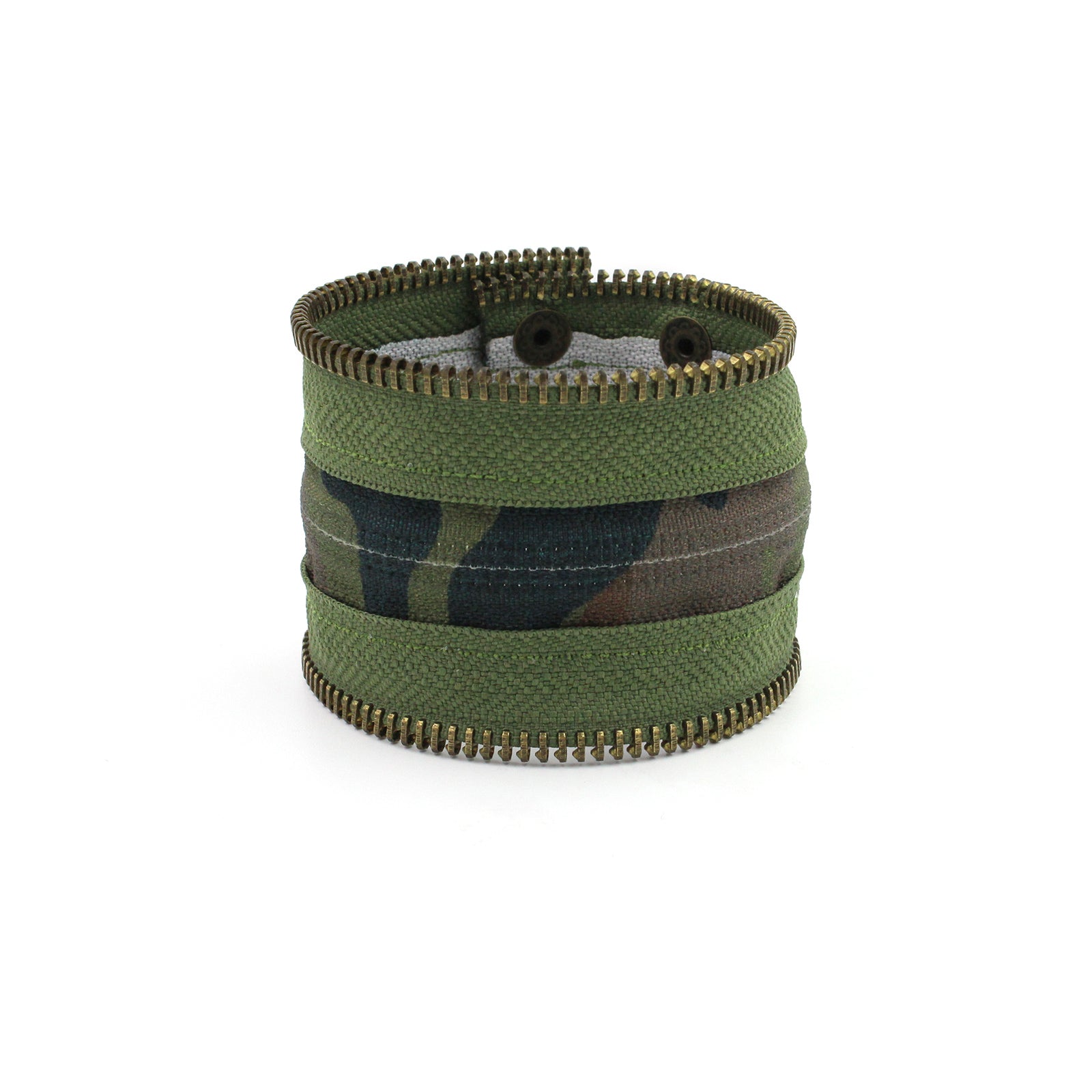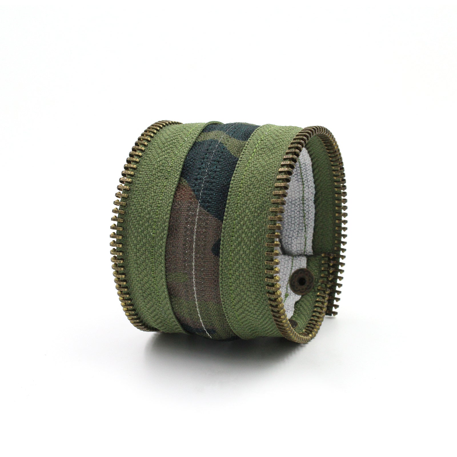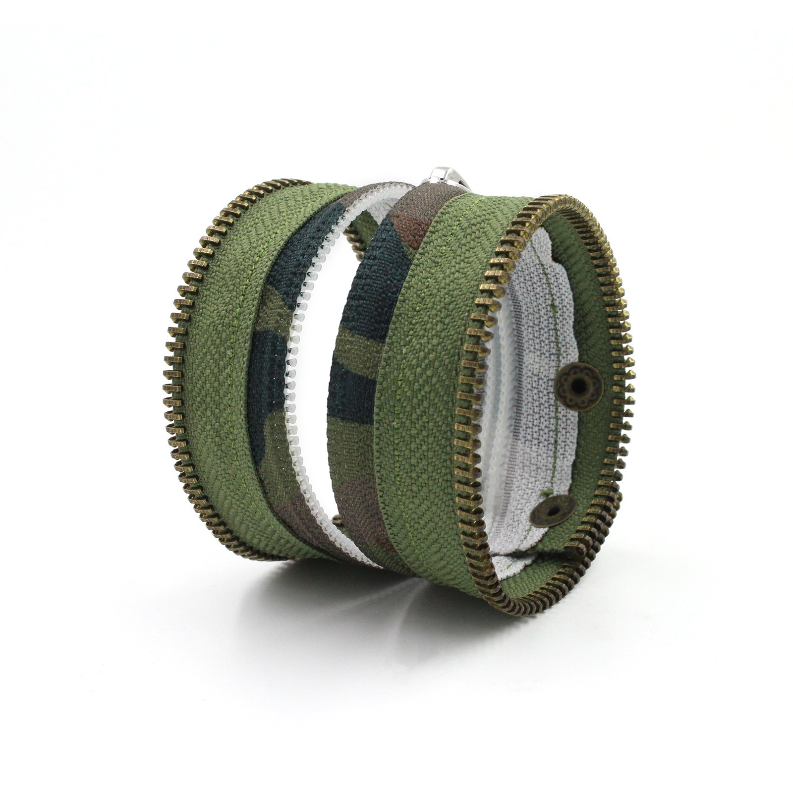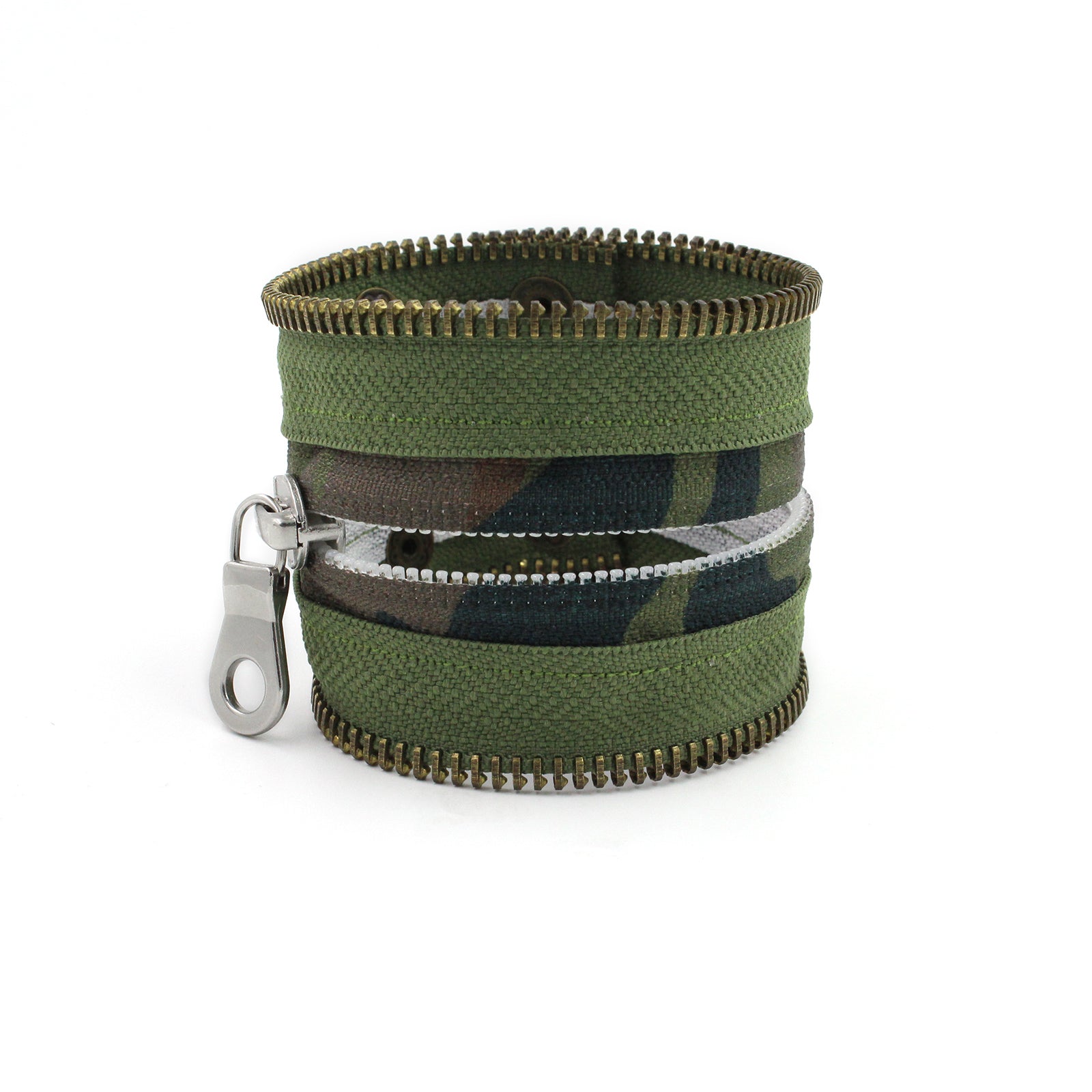 $20.00 USD$0.00 USDAvailable: Out Of Stock :-(Classy camouflage zipper bracelet. Dark green camouflage inner zipper with invisible teeth. Olive green outer zipper with antique gold teeth. Olive green topstitch. Antique gold snaps. Nickel zipper pull. Bracelet width: 1.75" Size: Adjustable 2 ways - 7" and 8" (Small to Large)