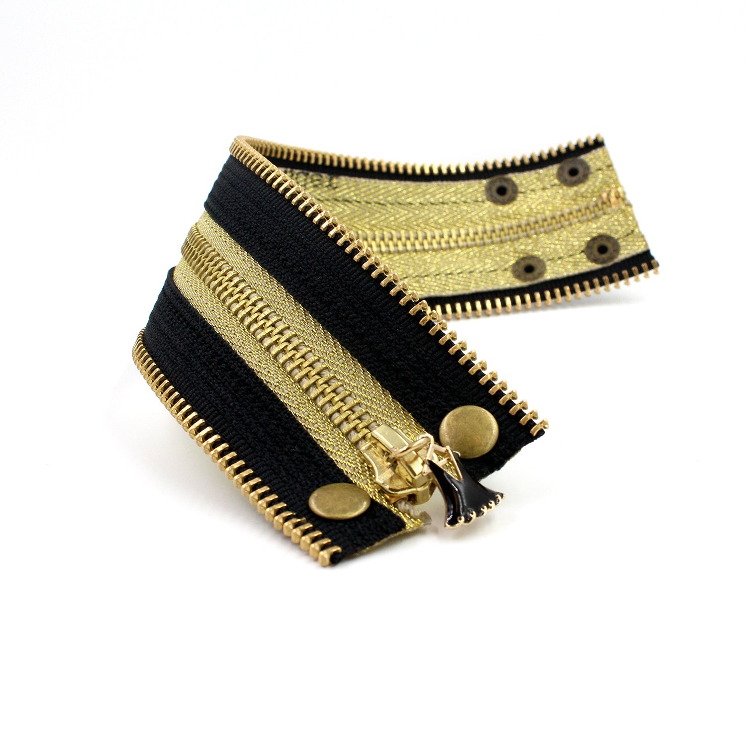 $40.00 USD$0.00 USDAvailable: Out Of Stock :-(Time for dressing up and cocktails zipper bracelet with special metallic inner zipper! Metallic Gold inner zipper with brass teeth. Black outer zipper with brass teeth. Black topstitch. Antique gold snaps. Little black dress gold and black enamel zipper pull charm. Bracelet width: 1.75" Size: Adjustable 2 ways, 7.75" and 8.5" (Large)