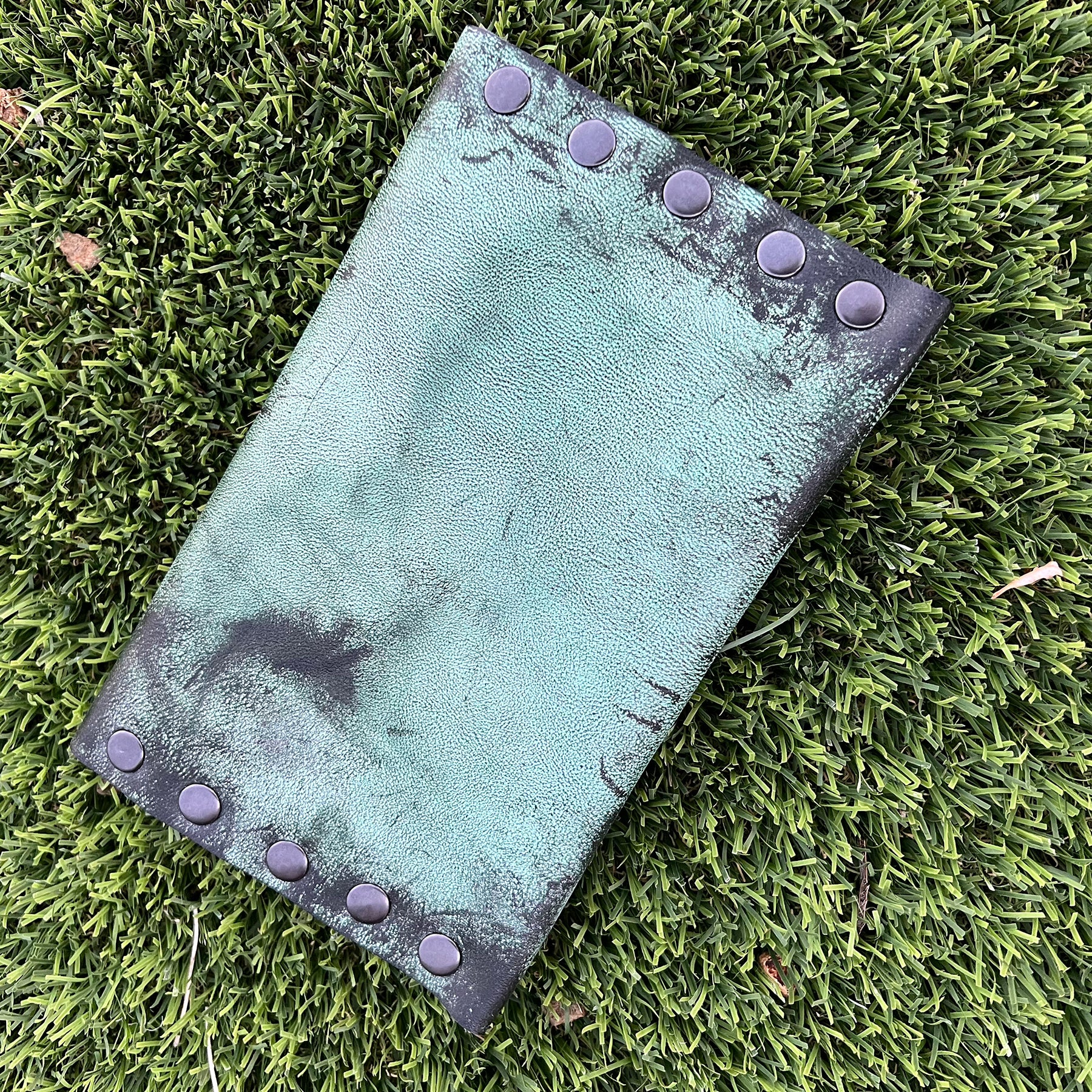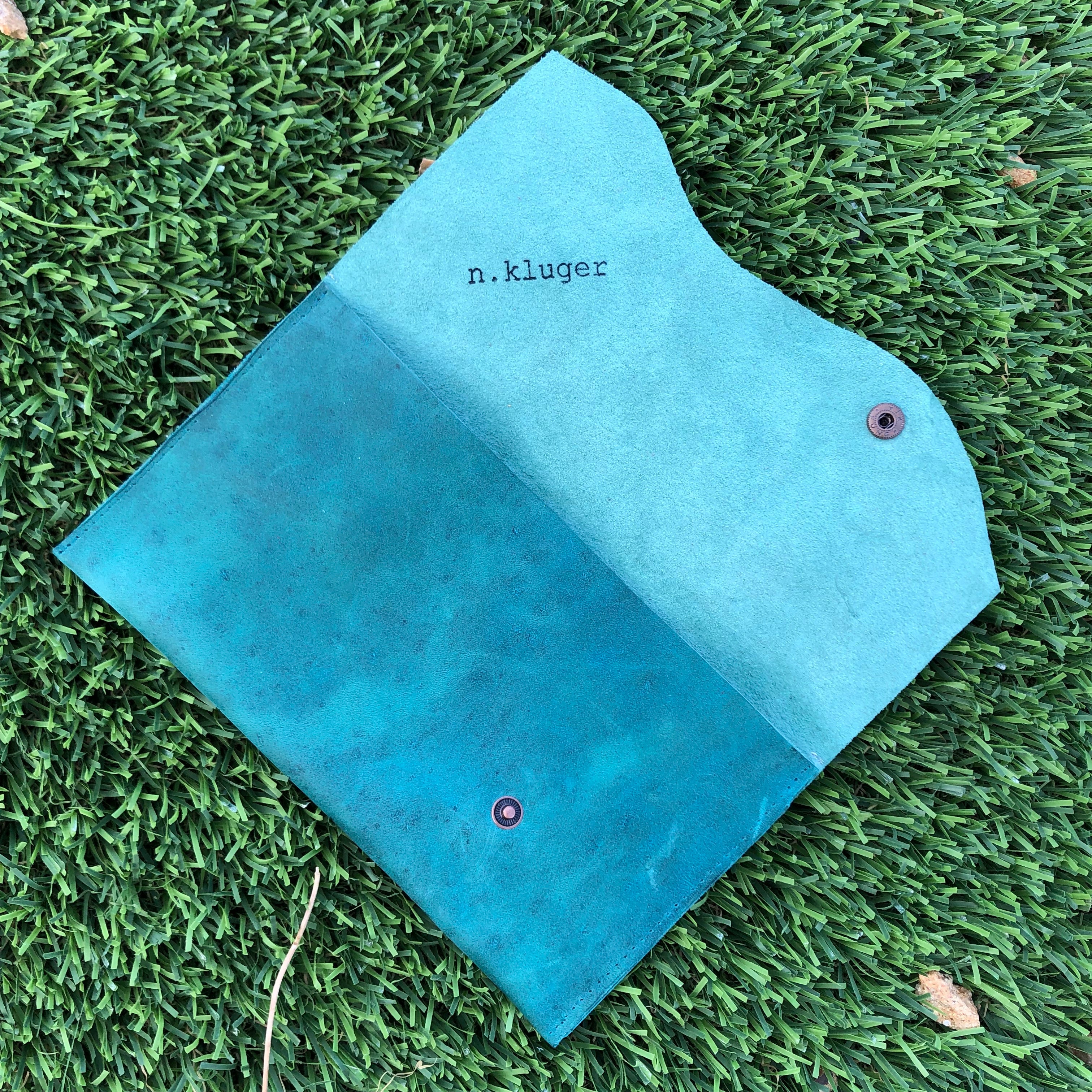 $75.00 USD$0.00 USDAvailable: Out Of Stock :-(Handmade one-of-a-kind quality genuine leather clutch. Distressed vintage-feel pale green leather clutch with gunmetal rivets and gunmetal snap closure. Size: 9.5" width x 6" height Please note the colors in the photos on your screen may differ slightly from the actual...
