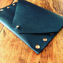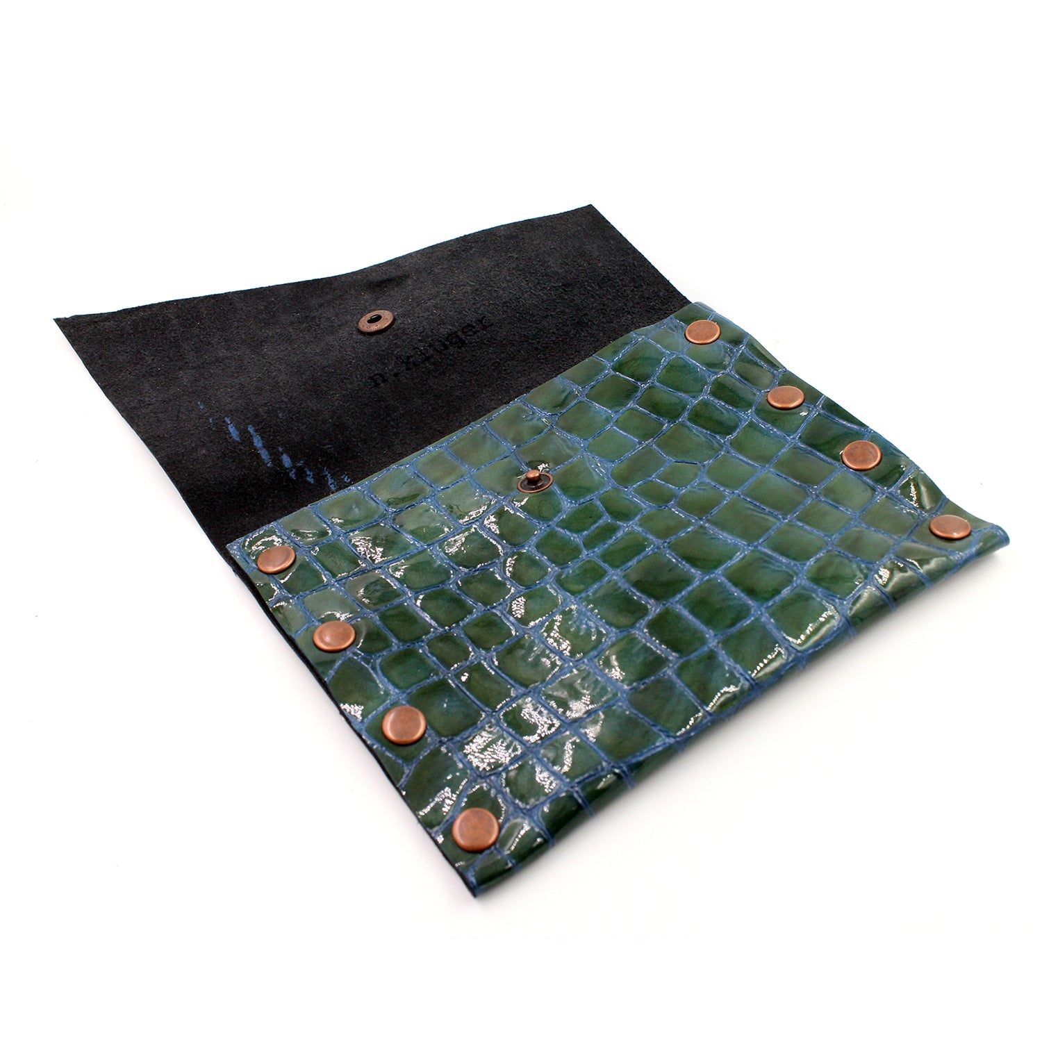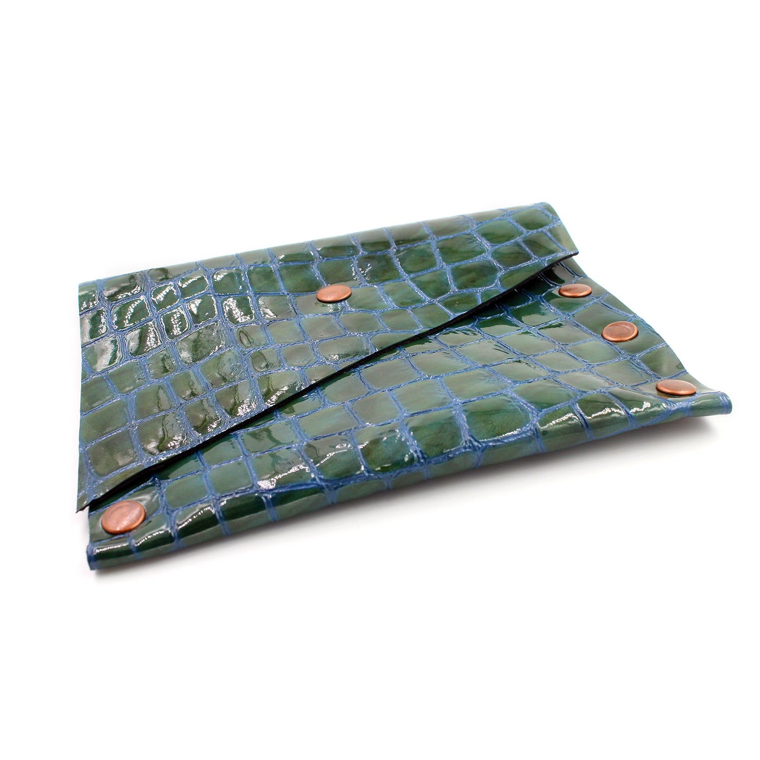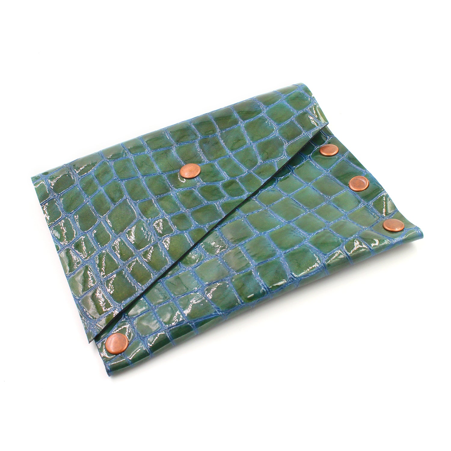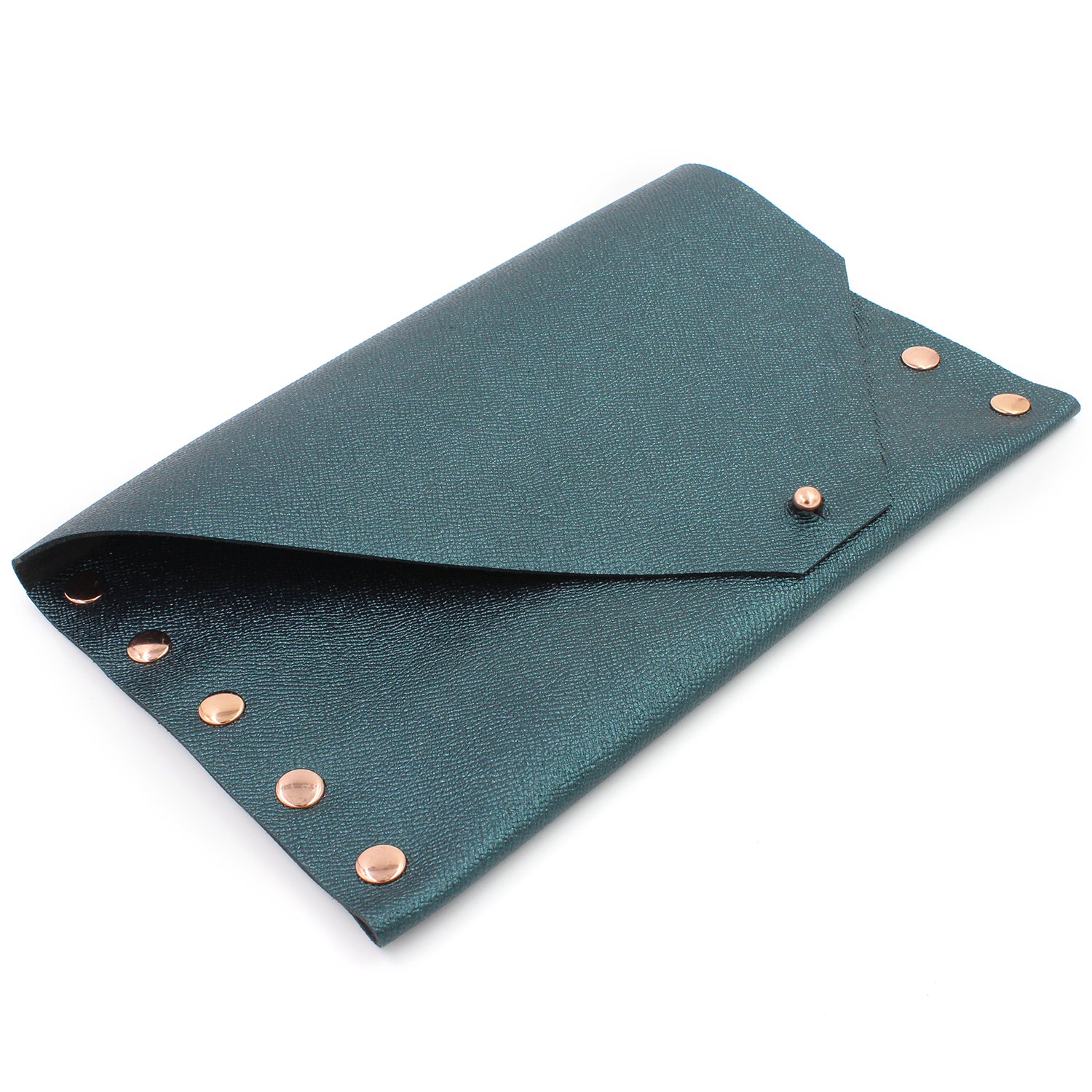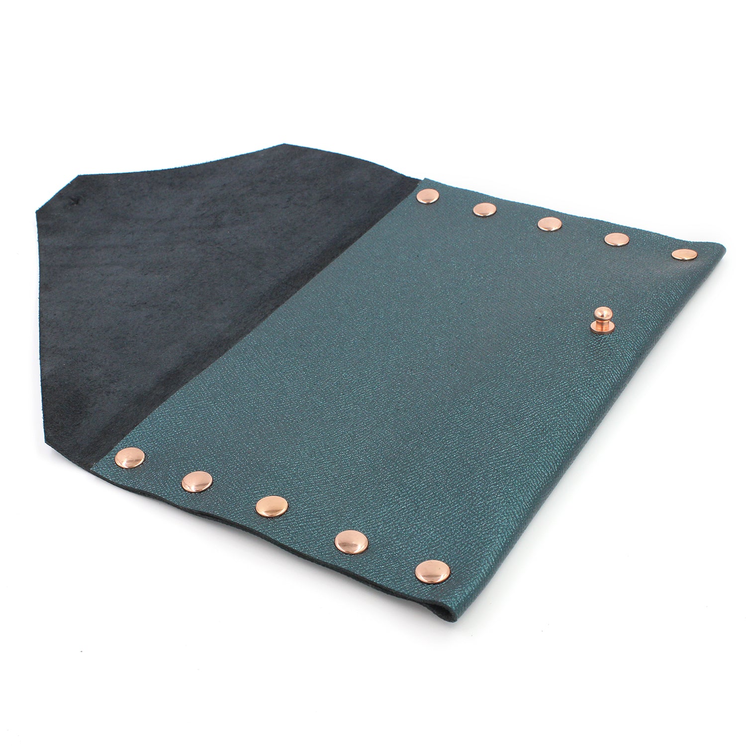 2nd Edition Shimmering Green/Blue Leather Clutch with Rose Gold Rivets