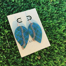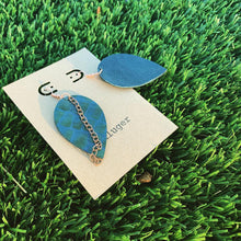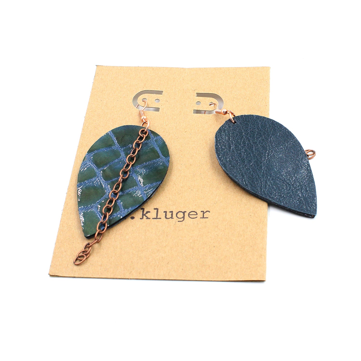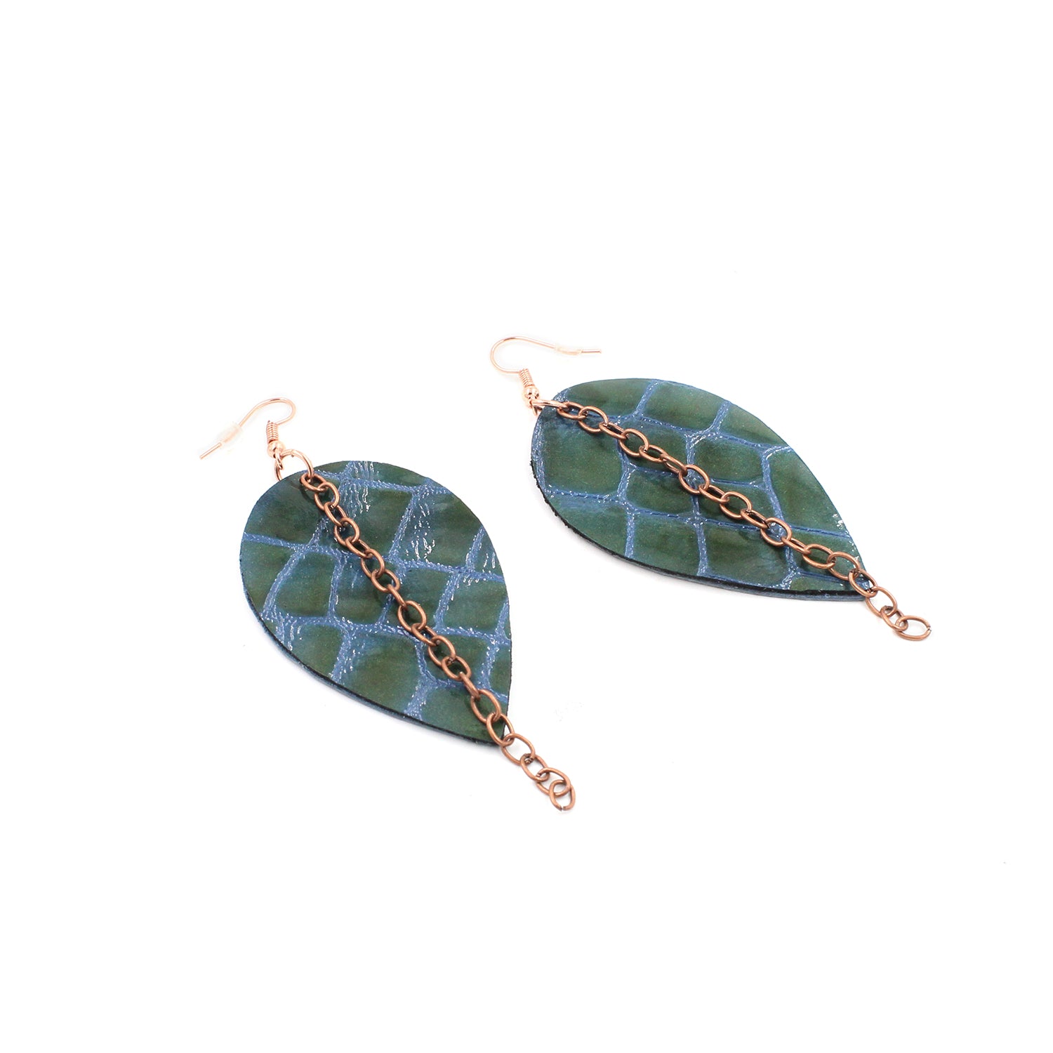 $25.00 USD$0.00 USDAvailable: In stockHandmade reverse drop earrings with green and blue genuine patent leather with crocodile texture and copper chain detail. Teal blue leather backside. 100% pure nickel-free copper ear wire. Size: 3.5" total drop. 1.5" width at widest point.