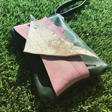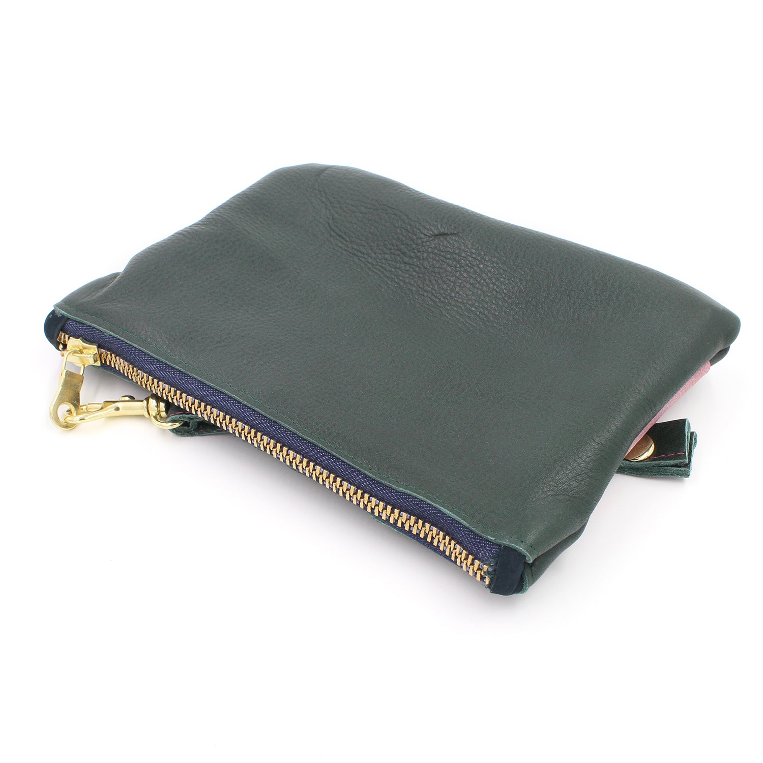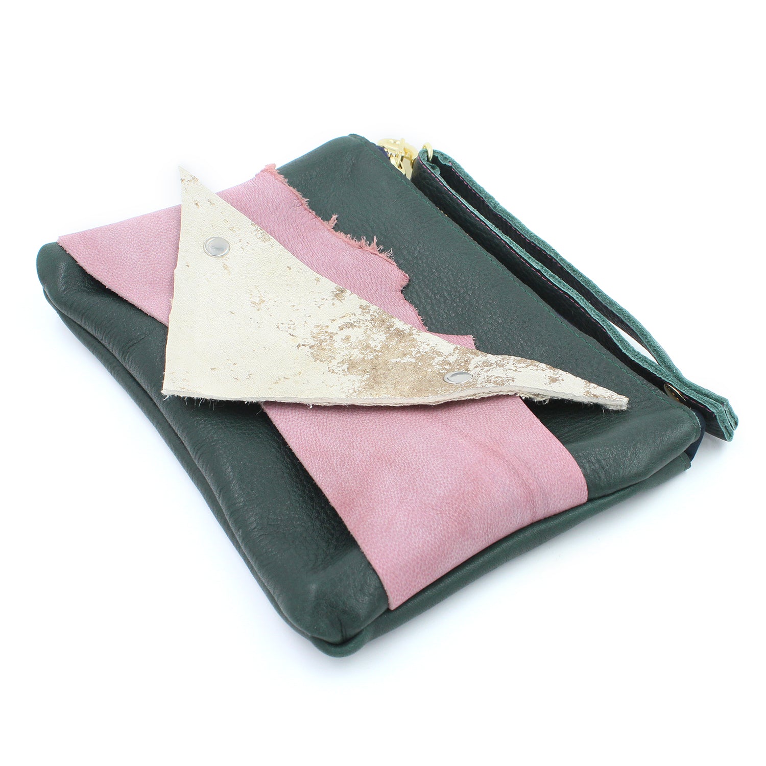 $75.00 USD$0.00 USDAvailable: In stockAdorable mini clutch with detachable leather wristlet strap. Handmade green soft genuine leather miniature clutch with denim jeans zipper closure. Pink distressed and cow-print layered abstract leather design sewn-in hand strap. Detachable green leather wristlet strap. Measures 7.75" wide x 5.25" height
