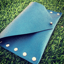 $75.00 USD$0.00 USDAvailable: Out Of Stock :-(Your night on the town just got more exciting! Handmade one-of-a-kind quality genuine leather clutch with polished rose gold-colored rivets and polished rose gold-colored button closure. Leather is a shimmering green/blue pebble, black underside. 10.75" wide x 7" height