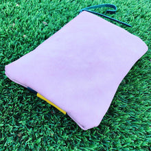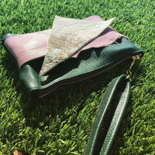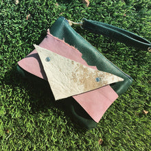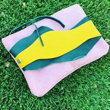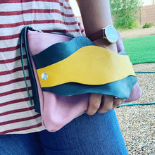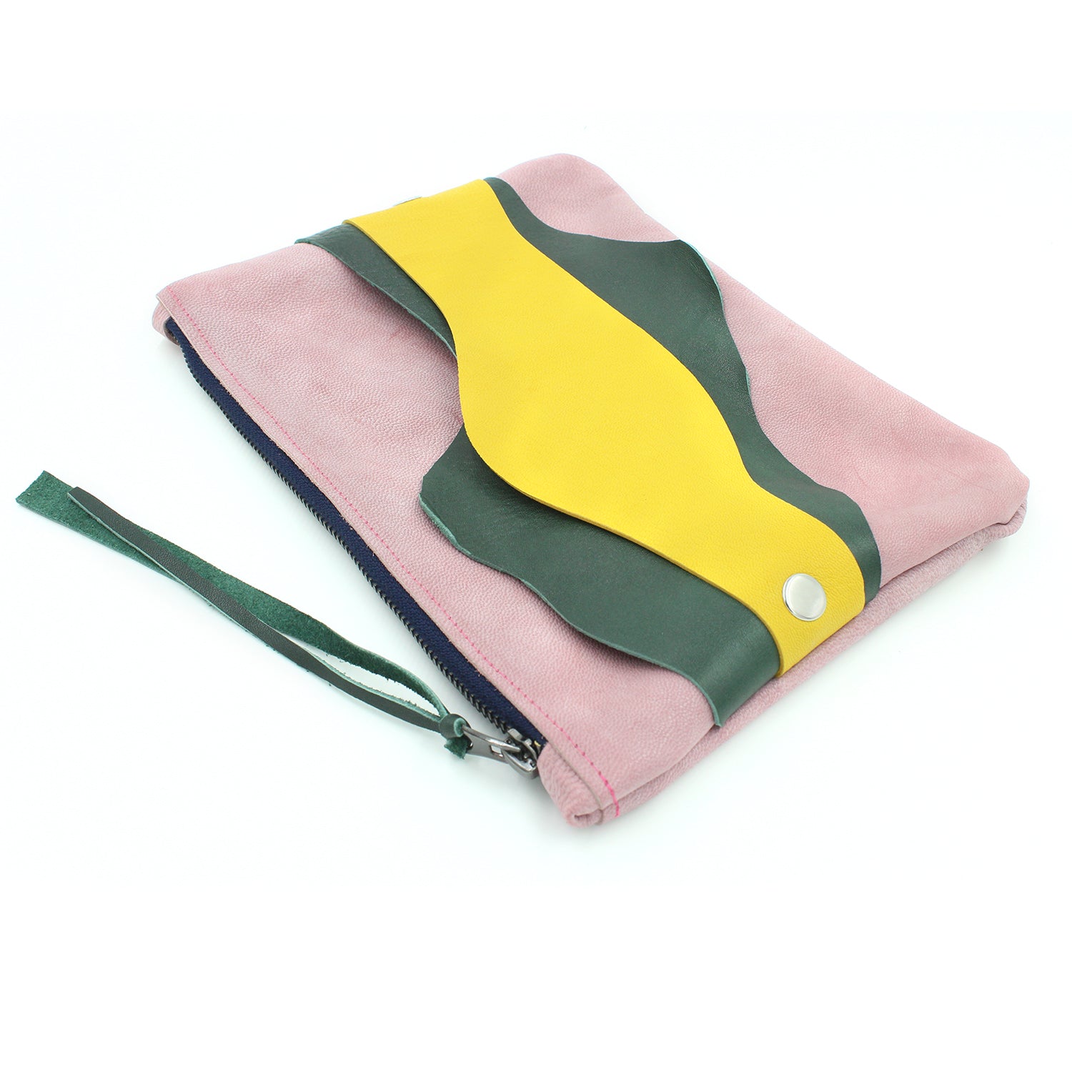 $75.00 USD$0.00 USDAvailable: Out Of Stock :-(The pink clutch that's not really a pink clutch that you didn't know you needed until now. Handmade pink genuine leather clutch with navy blue zipper closure. Green and yellow layered abstract design sewn-in hand strap. Measures 10" wide x 7"...
