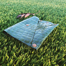 $20.00 USD$0.00 USDAvailable: Out Of Stock :-(Super cute all-business business card case and mini wallet. Handmade genuine blue and green crocodile print patent leather business card/credit card case/mini wallet, black leather interior with copper rivets. Copper snap closure. Each card case is unique. Size: 5.75" wide x 4.5" height (when closed)