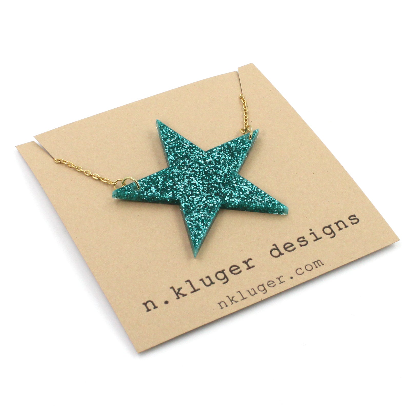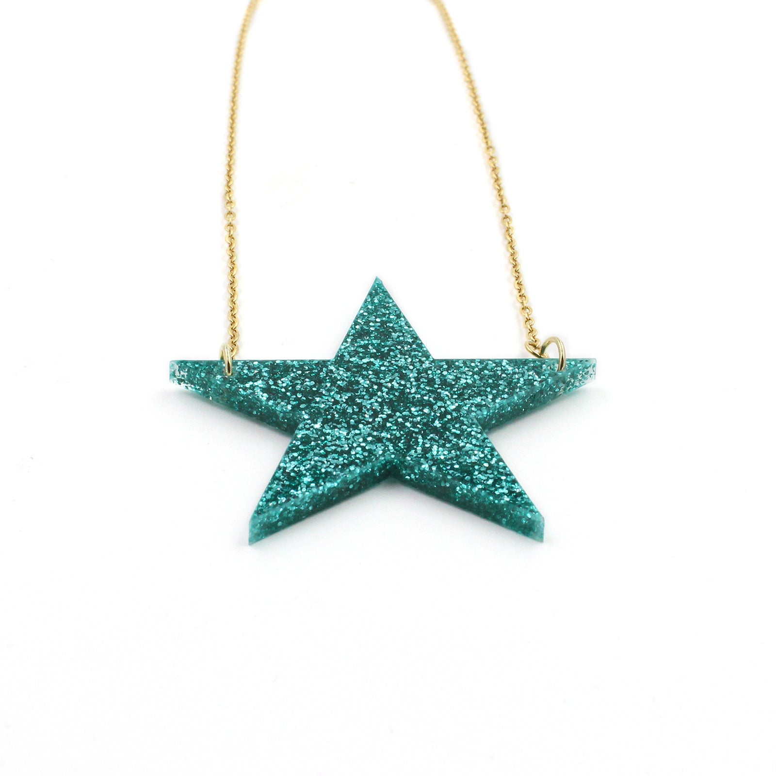 $23.00 USD$0.00 USDAvailable: Out Of Stock :-(Handmade acrylic laser-cut large green/blue glittery star pendant on an adjustable gold-plated metal chain. Star-size: 2" x 2"Necklace total length: Adjustable from 18.5" to 20.5" Nickel-free