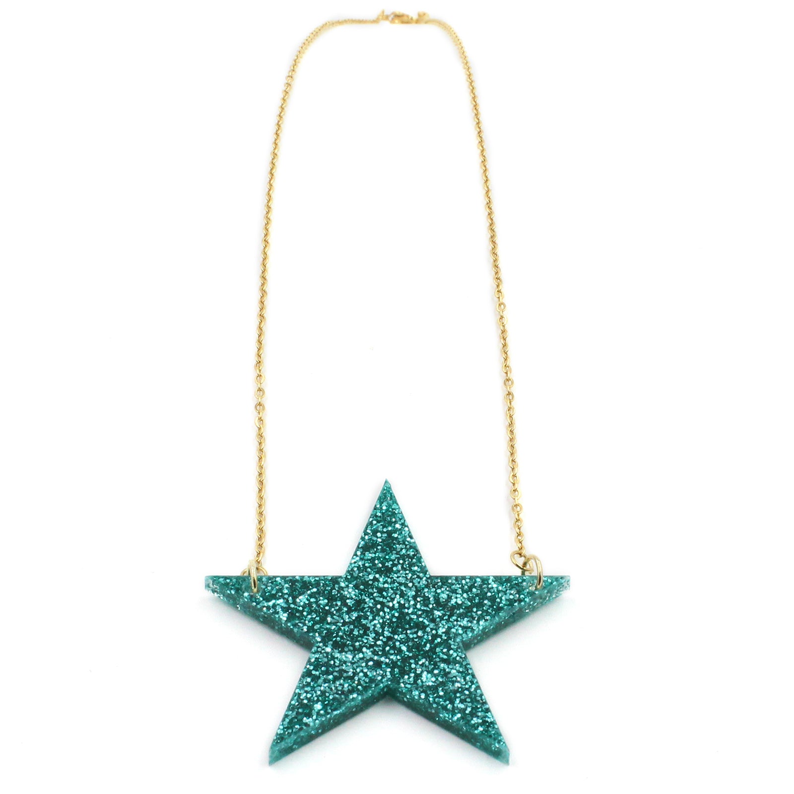 Acrylic Teal Glitter Star Necklace on Gold Chain