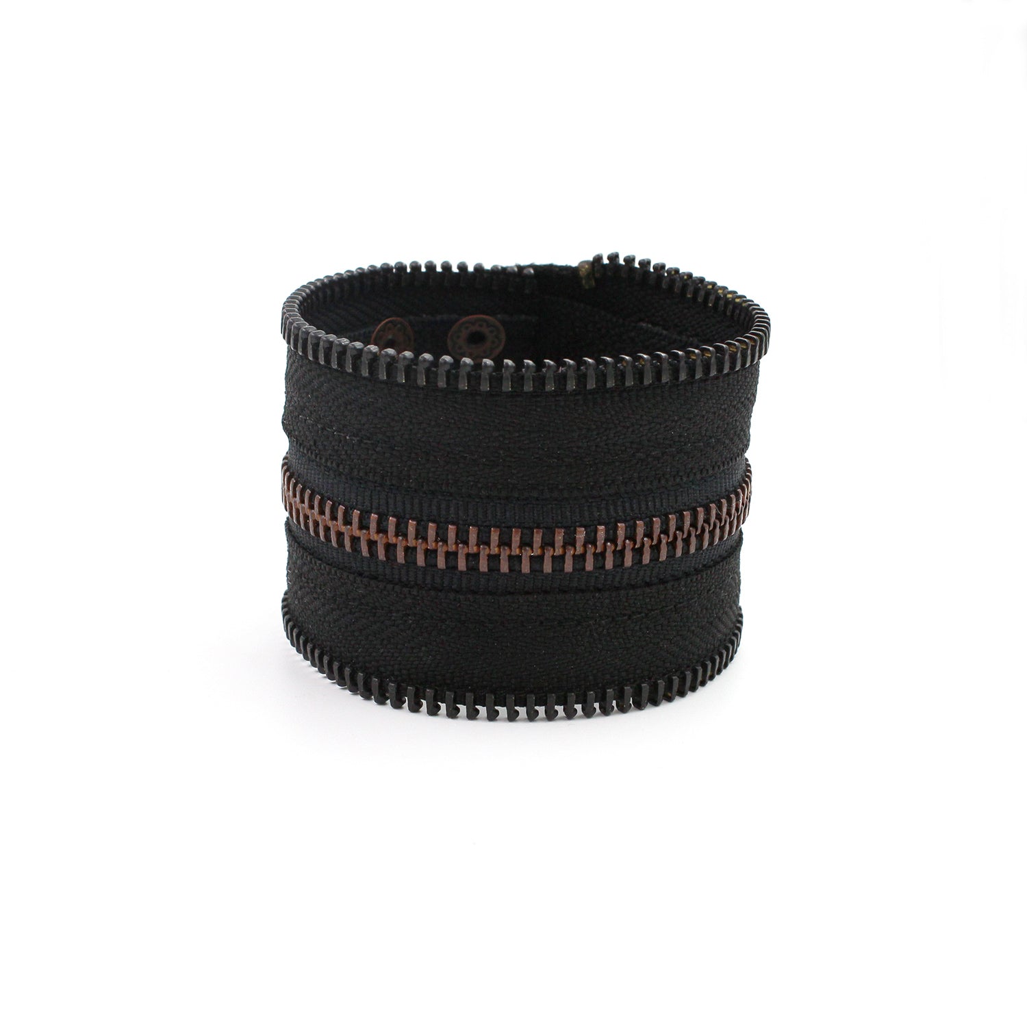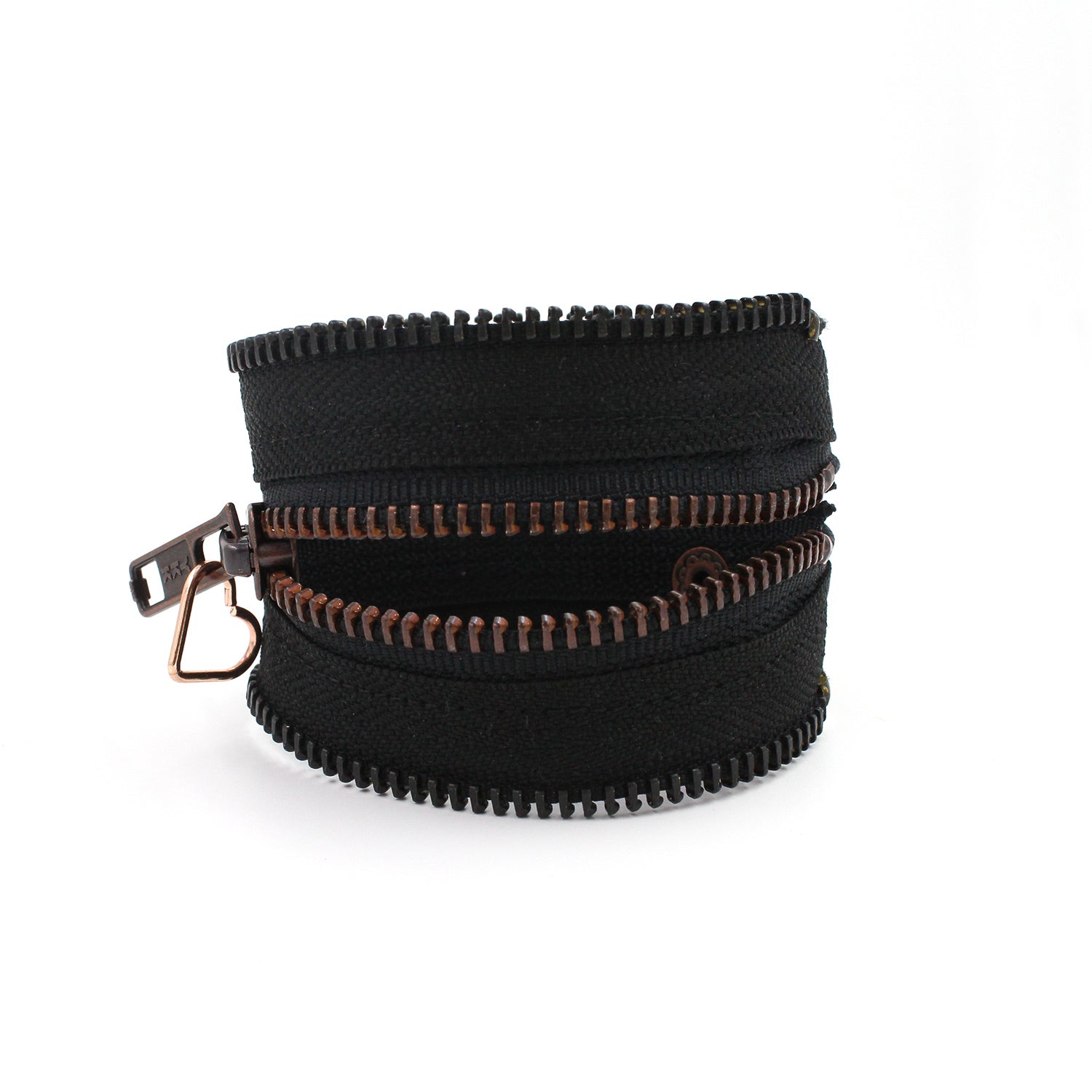 $30.00 USD$0.00 USDAvailable: Out Of Stock :-(Subtle and rich zipper bracelet in black and copper. Black inner zipper with antique copper teeth. Black outer zipper with black teeth. Black topstitch. Copper snaps. Antique copper classic zipper pull with copper heart charm. Bracelet width: 1.75" Size: Adjustable, 7.25" and 7.875" (Medium & Large)