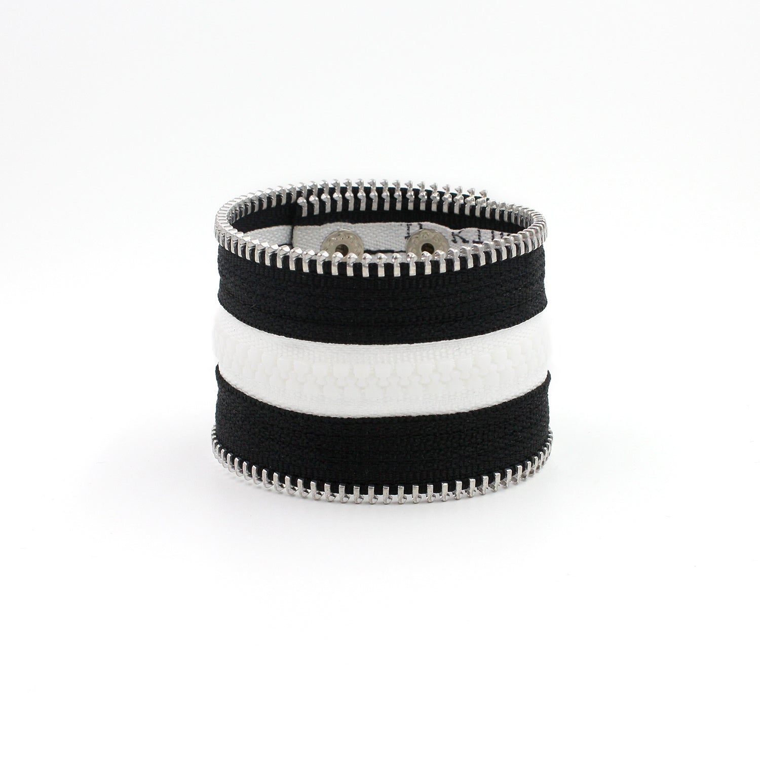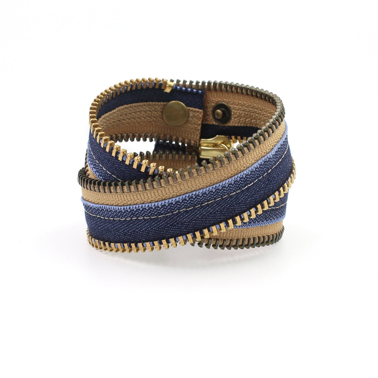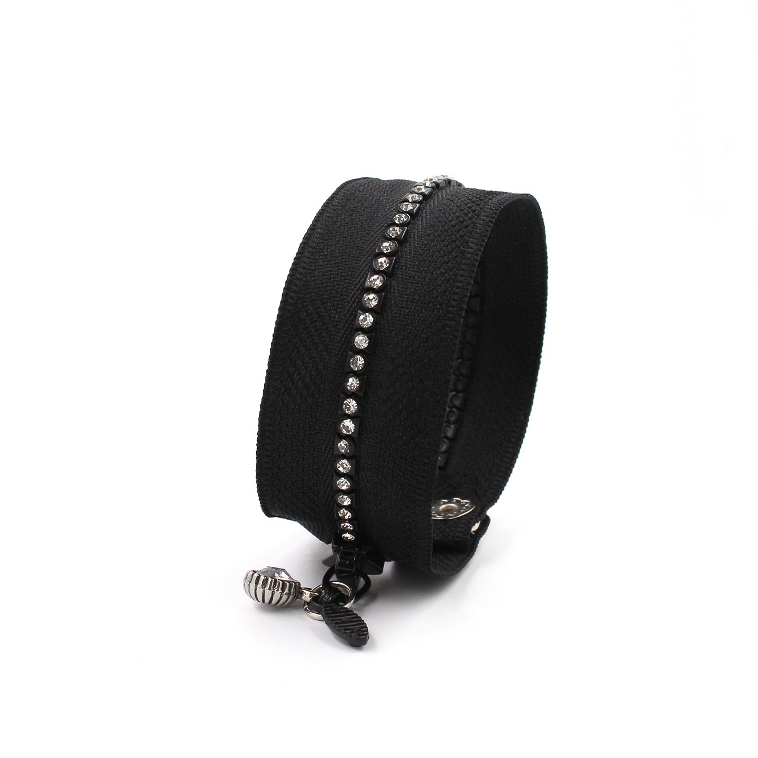 $35.00 USD$0.00 USDAvailable: Out Of Stock :-(Jazz up your jeans zipper bracelet. Blue jeans inner zipper with silver teeth. Black outer zipper with oversized crystal teeth. Black topstitch. Nickel snaps. Nickel zipper pull. Bracelet width: 2.25" (including the crystals)Size: Adjustable 2 ways, 7" and 7 3/4" (Small/Medium to Large)