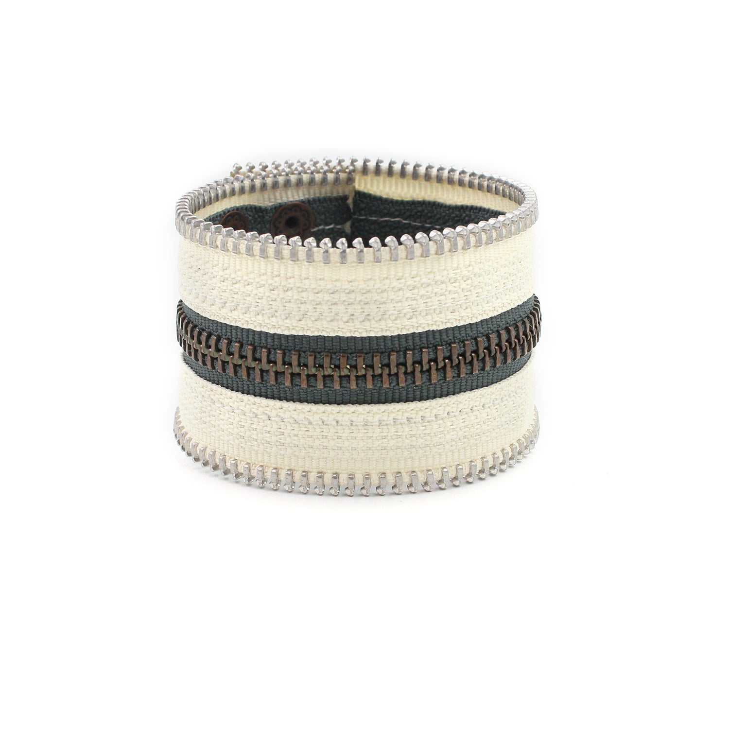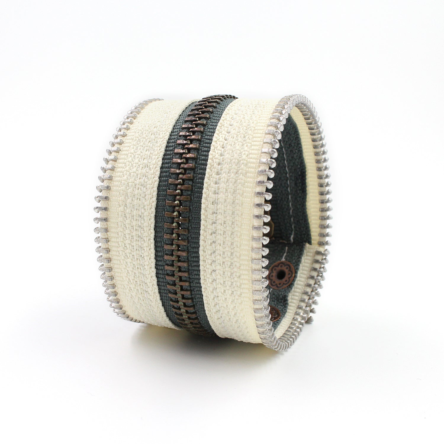 $30.00 USD$0.00 USDAvailable: In stockSophisticated casual grey and cream zipper bracelet with some copper charm mixed in. Grey inner zipper with antique gold teeth. Cream outer zipper with silver teeth. White topstitch. Copper snaps. Antique gold zipper pull with rose cross charm. Bracelet width: 1.75" Size: Adjustable, 7" and 7.5" (Medium)