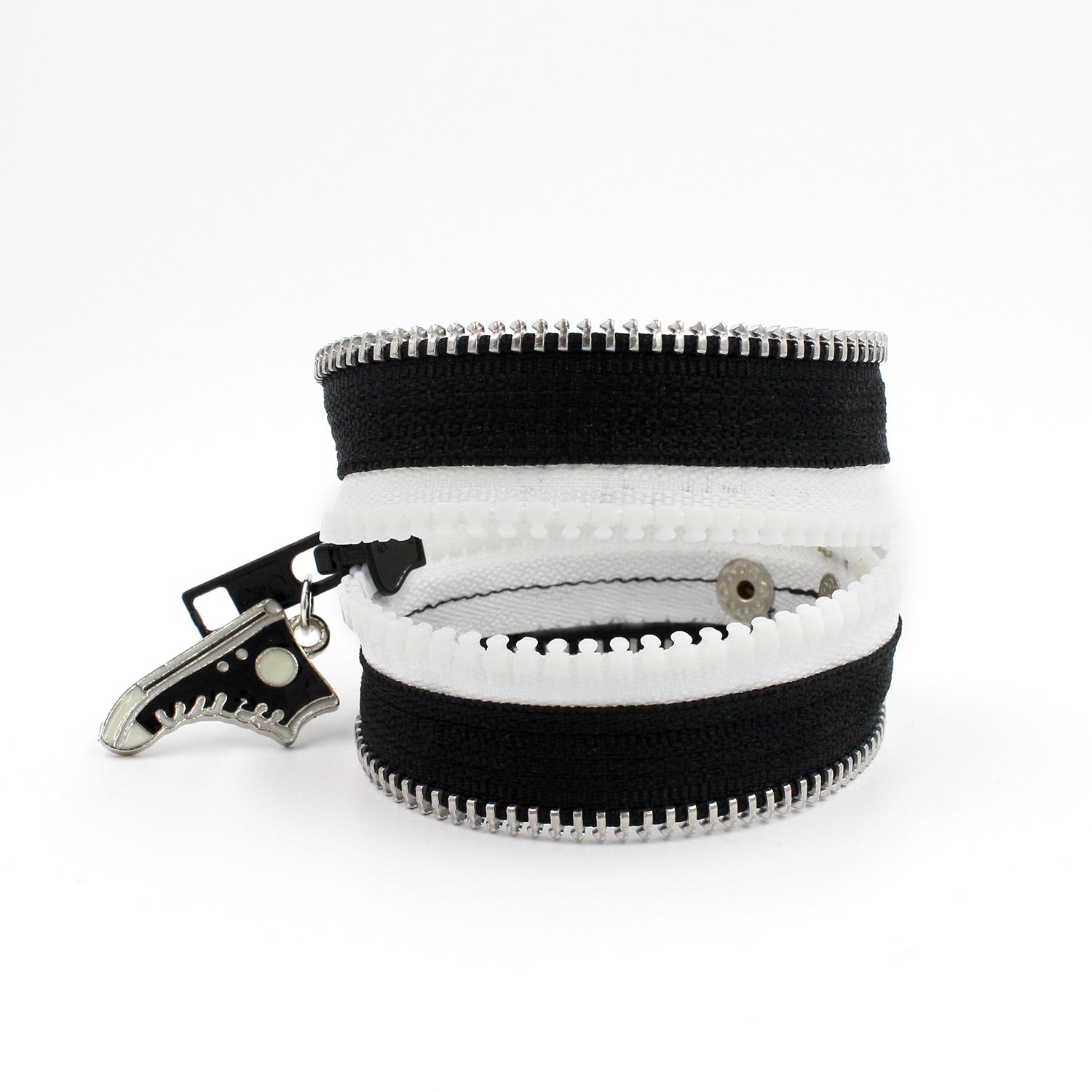 $30.00 USD$0.00 USDAvailable: Out Of Stock :-(Sportin' the high tops zipper bracelet. Perfect for the Xennial (Gen X pre-millennial) who can appreciate a simpler time but is still fashion-forward. White inner zipper with white teeth. Black outer zipper with nickel teeth. Black topstitch. Black snaps. Black classic zipper pull with high tops charm....