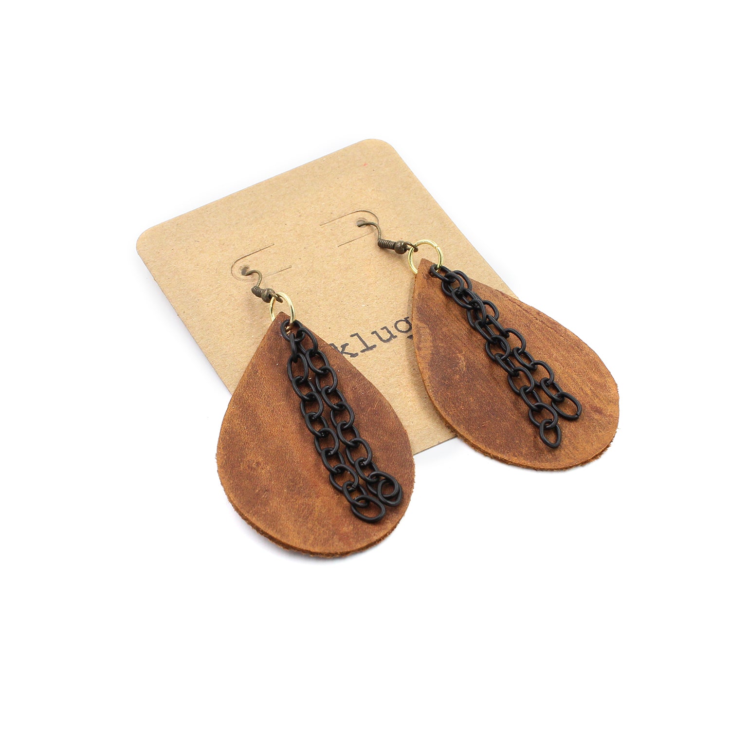 Handmade casual drop earrings with rustic brown leather and black chain detail.