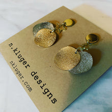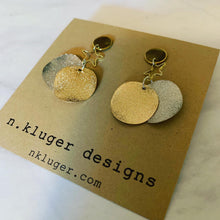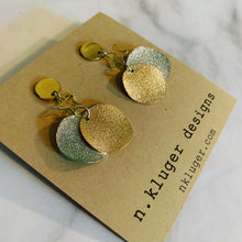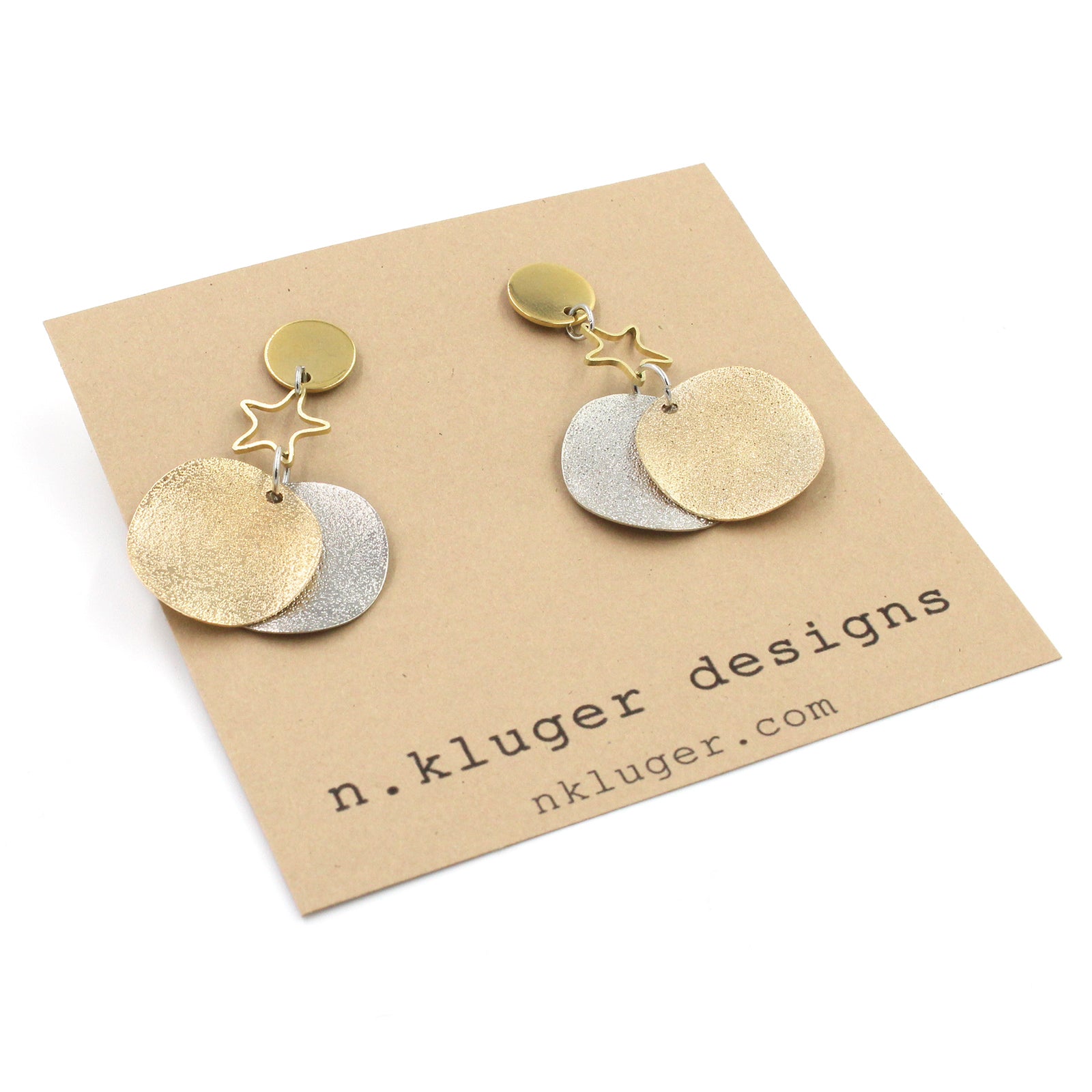 $18.00 USD$0.00 USDAvailable: In stockGold & Silver metal wavy disc earrings with star connectors and with gold-tone stainless steel posts with push-back closure. Nickel-free Size: 20mm at widest point, 46mm total length