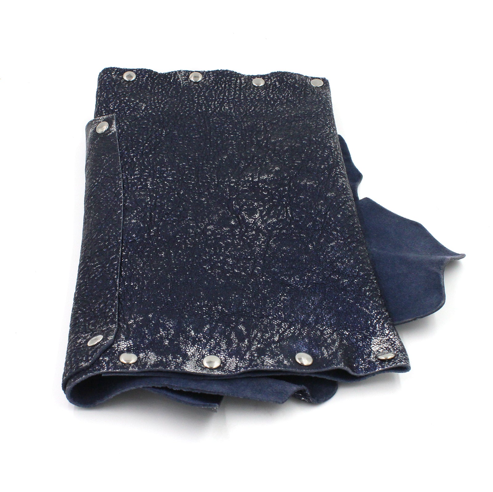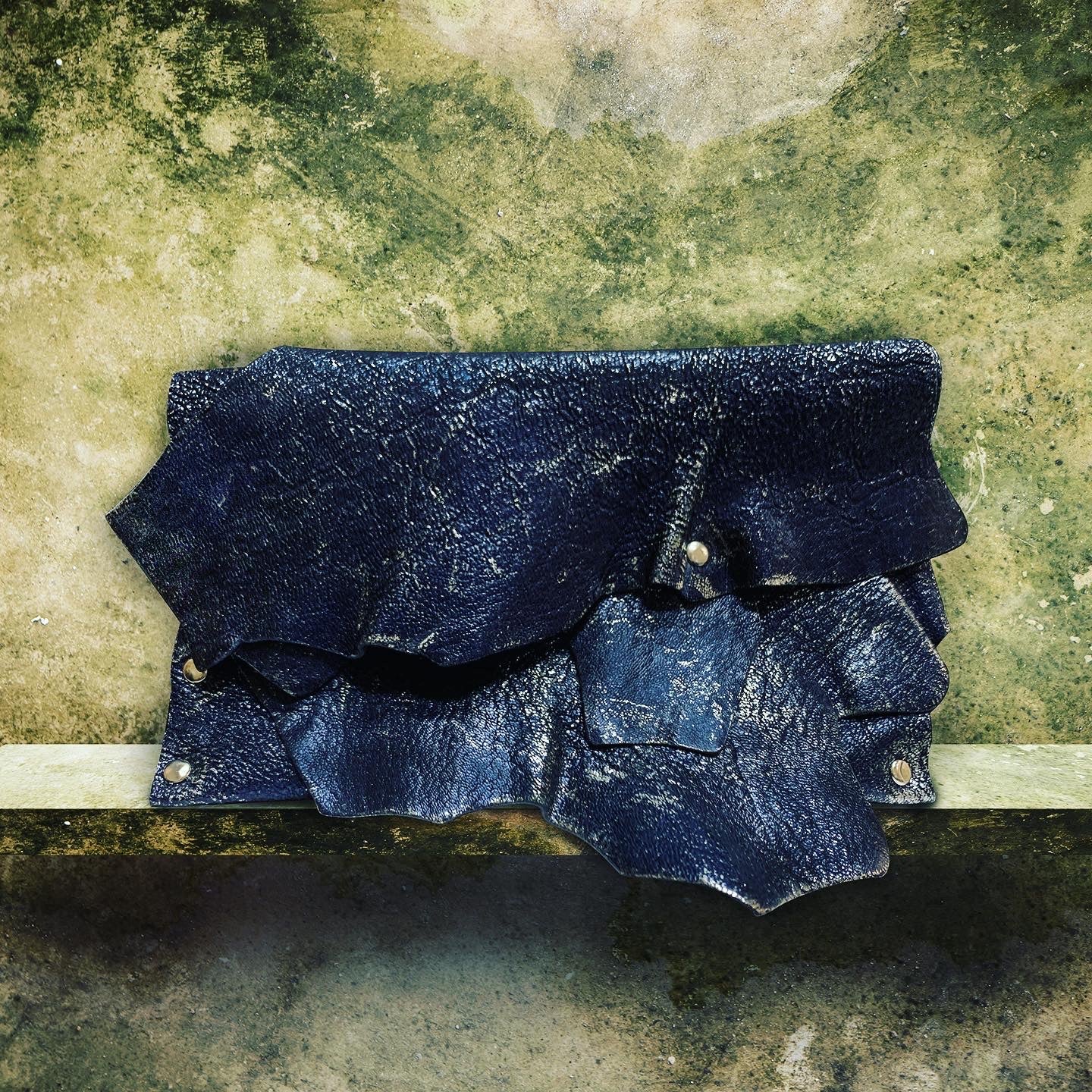$65.00 USD$0.00 USDAvailable: Out Of Stock :-(Handmade one-of-a-kind quality genuine leather clutch. Made with lightweight midnight blue textured leather with hints of silver foil edging through. Angled edges adorned with chrome rivets and a chrome magnetic closure. Detachable wristlet strap. Clutch size: 7.25" - 8.25" in width x...