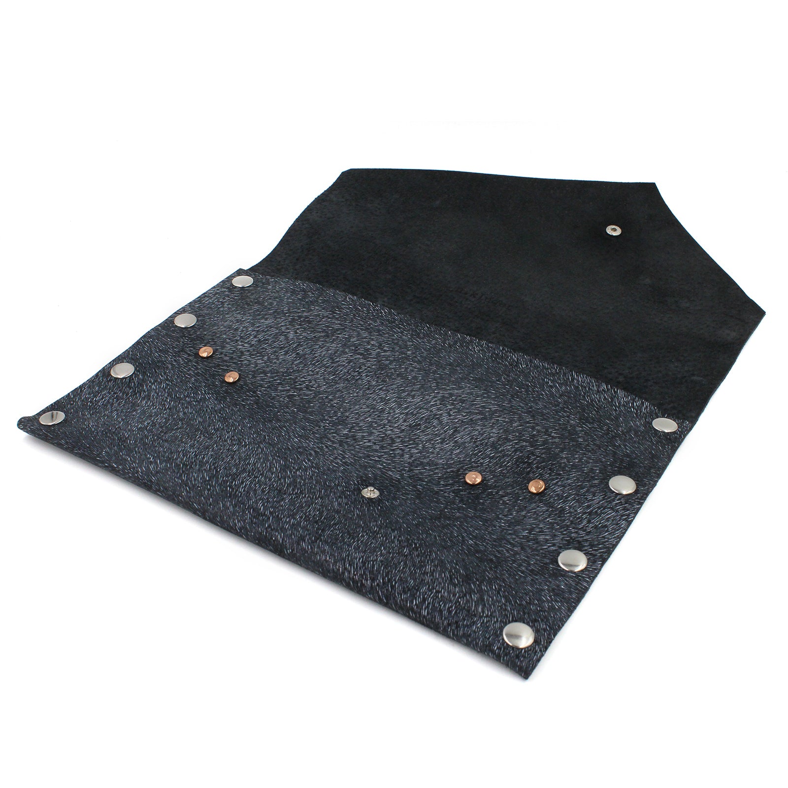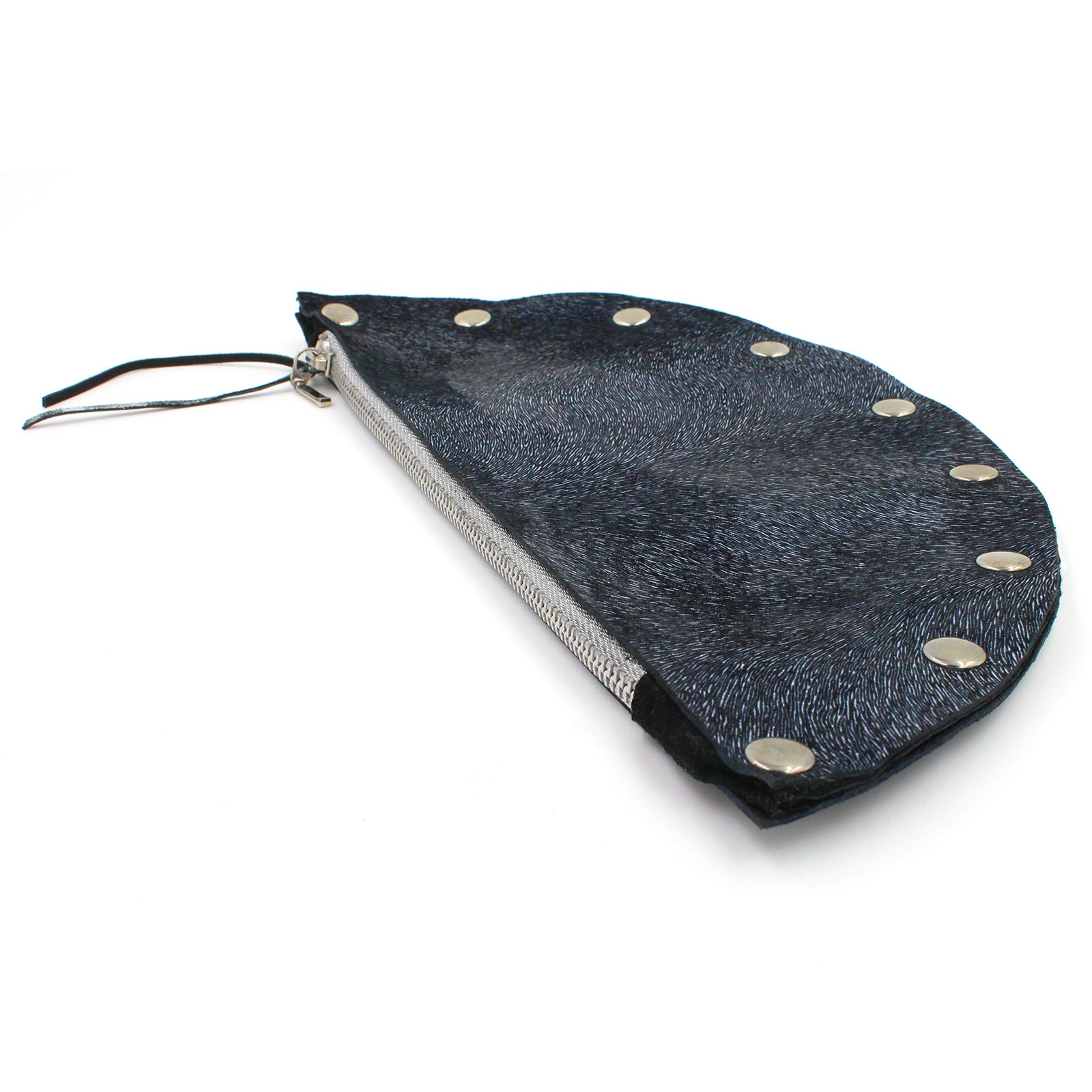 $69.00 USD$0.00 USDAvailable: Out Of Stock :-(Handmade genuine navy blue leather clutch with a pattern that looks like it might be fur but it is not textured at all. The faux texture gives the purse a metallic appearance. Very cool printed leather. Adorned with polished nickel rivets, snap...