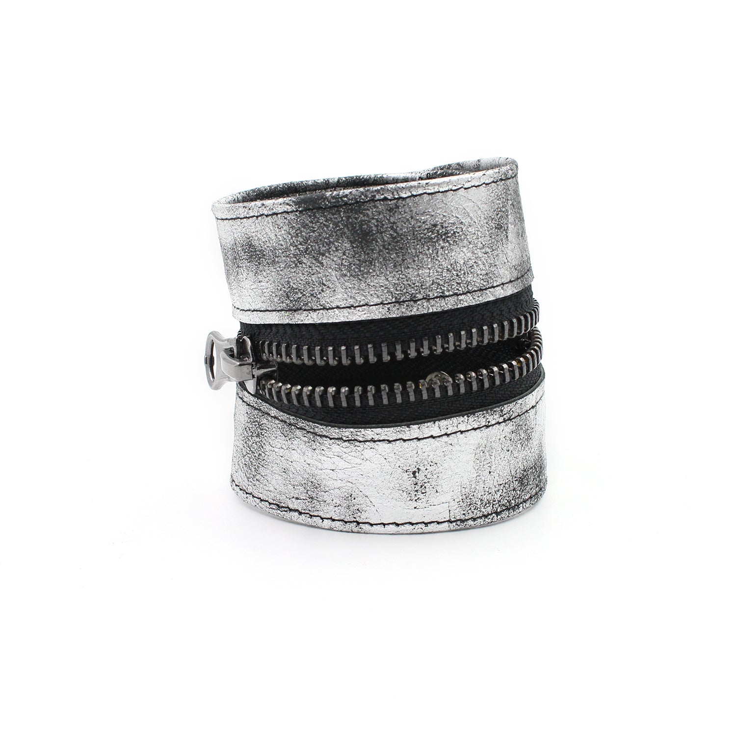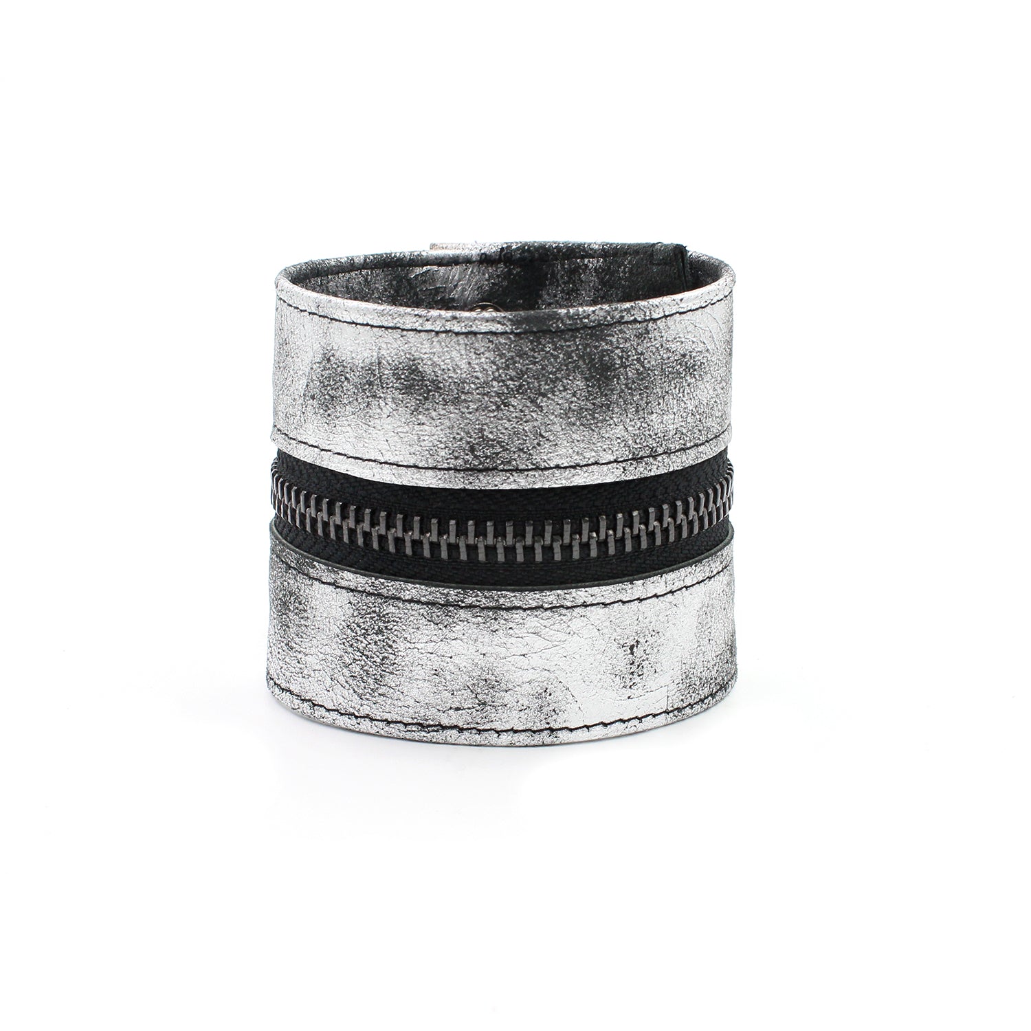 $35.00 USD$0.00 USDAvailable: Out Of Stock :-(Distressed soft metallic silver/gunmetal wide leather zipper bracelet. Black inner zipper with gunmetal teeth. Genuine distressed metallic silver/black leather outer bracelet. Black topstitch. Black snaps. Gunmetal classic zipper pull. Bracelet width: 2 1/3" Size: Adjustable 2 ways to fit most larger wrists, 7.5" and 8.5" (Medium/Large to X-Large)