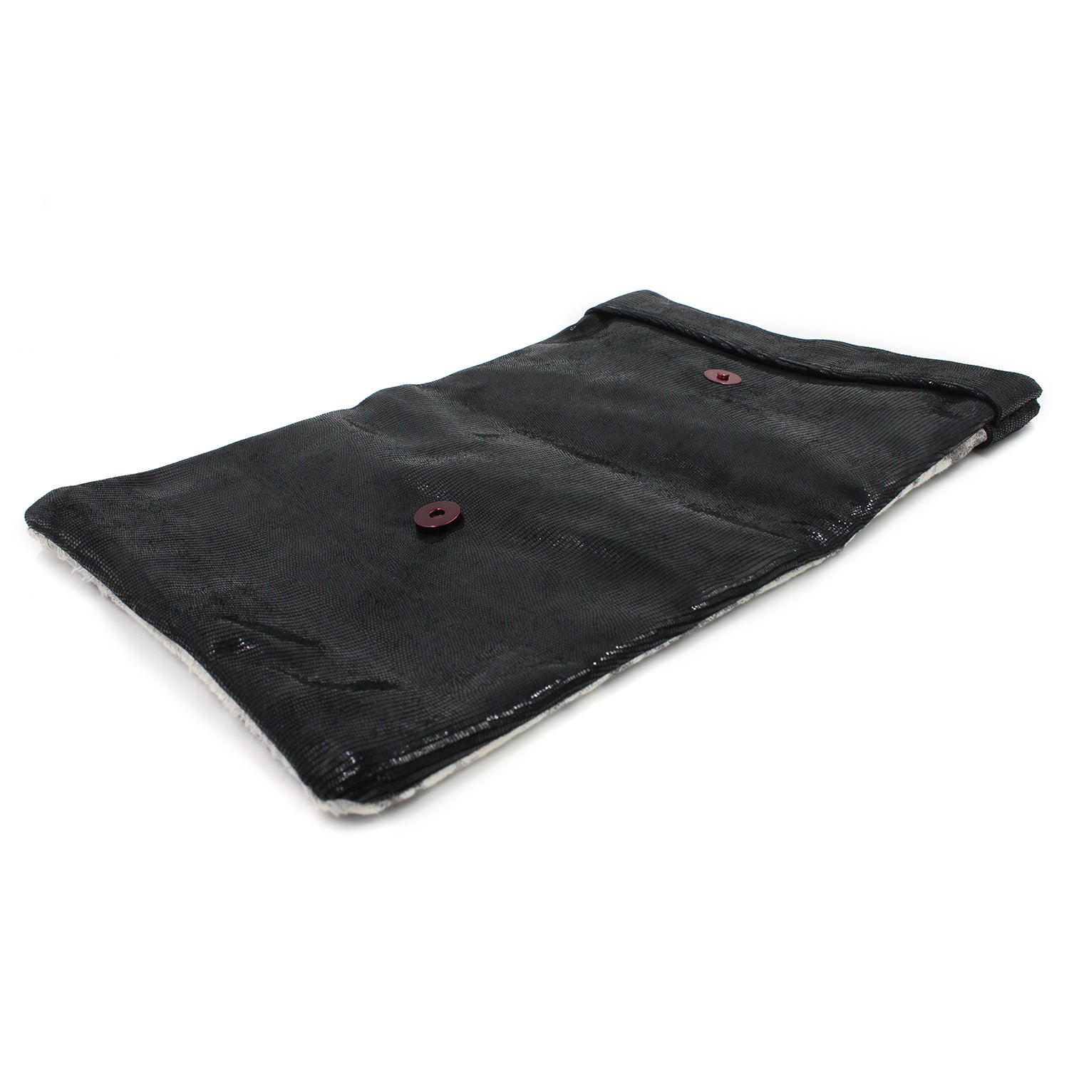 $75.00 USD$0.00 USDAvailable: Out Of Stock :-(Fun mixed media foldover clutch. Hand-finished. Black textured Italian patent leather with black suede underside mixed with grey and white metallic finish thick fabric. Magenta pink magnetic snap closure. Metallic silver zipper.Size:Closed, 10" x 7.5" Open, 10" x 14"One...