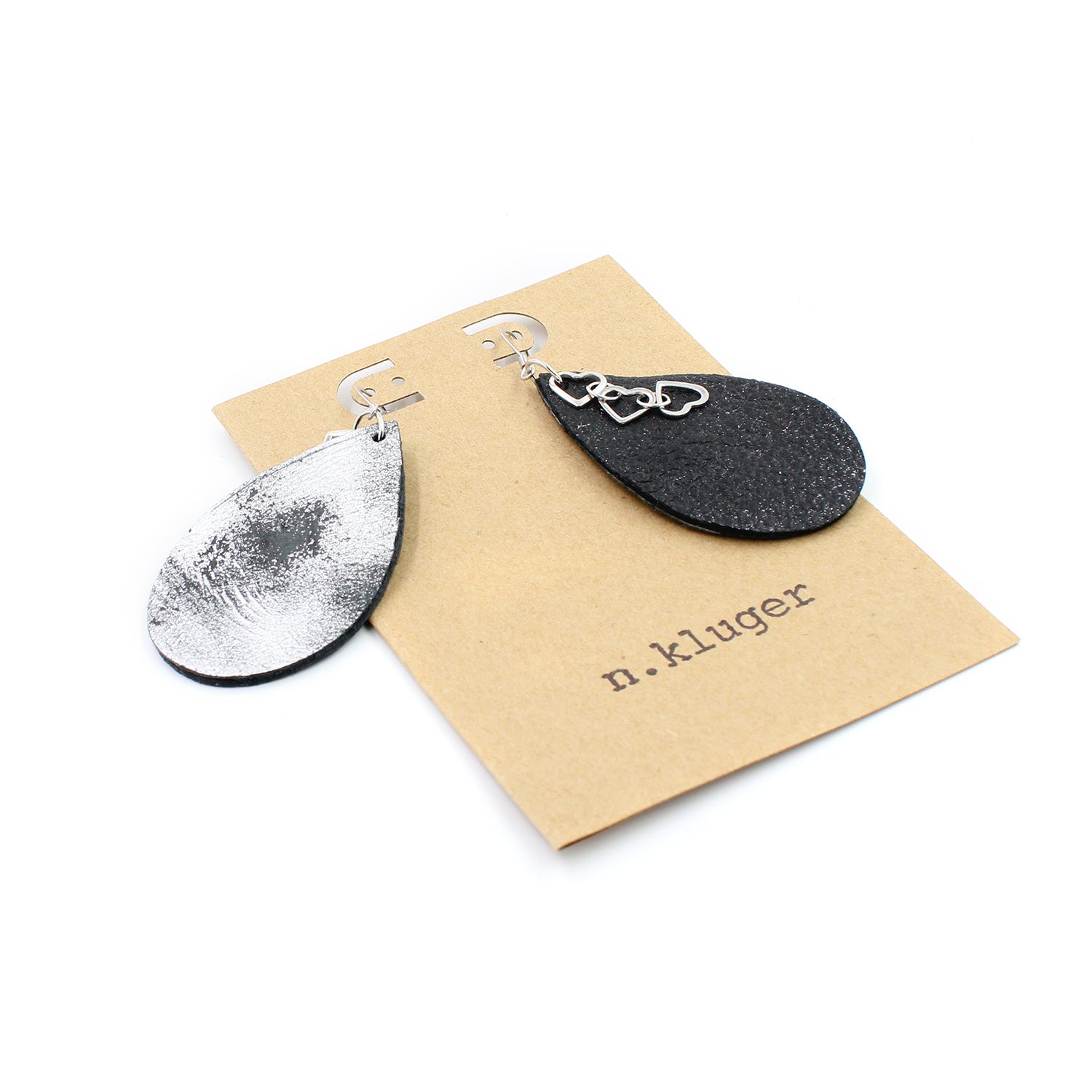 $25.00 USD$0.00 USDAvailable: Out Of Stock :-(Very cool handmade drop gunmetal black sparkly leather dangling earrings with silver and black metallic leather backside. Attached heart charms. Nickel-free steel ear wires. Size: 3" total drop. 1.5" width at widest point.