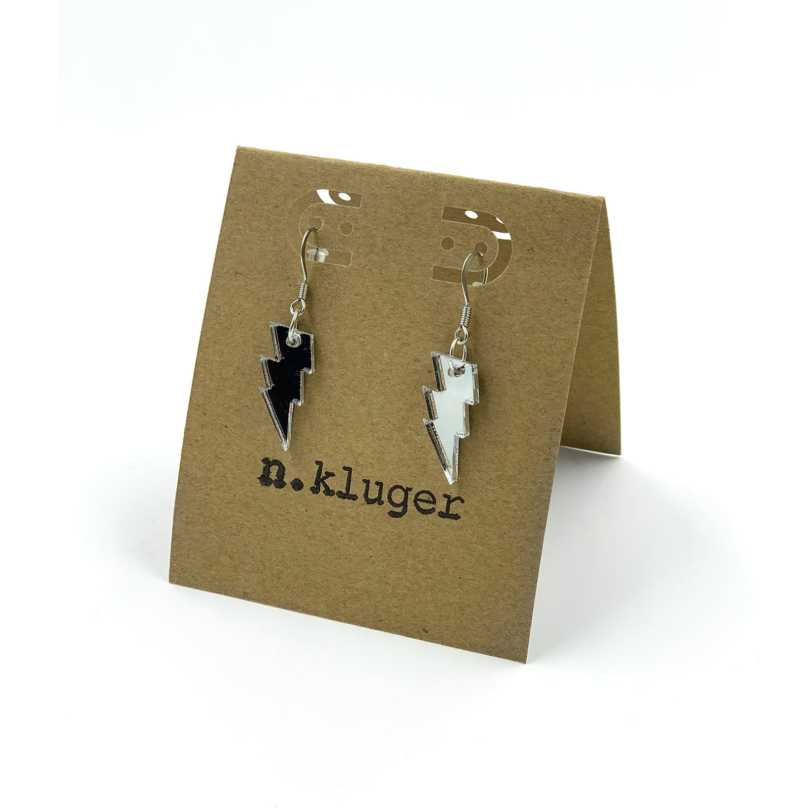 $12.00 USD$0.00 USDAvailable: In stockHandmade miniature acrylic laser-cut silver mirror lightning bolt drop earrings on nickel-free earring wires. Size: 1.25" long drop, less than 1/2" width