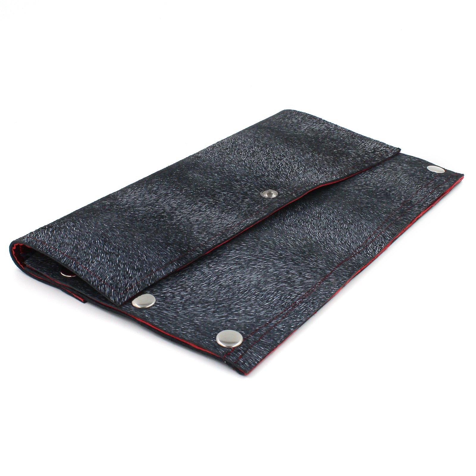 $155.00 USD$0.00 USDAvailable: In stockHandmade genuine navy blue leather clutch with a pattern that looks like it might be fur but it is not textured at all. The faux texture gives the purse a metallic appearance. Very cool printed leather. Fully lined interior with metallic red...