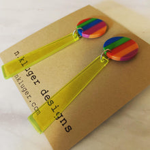 $15.00 USD$0.00 USDAvailable: In stockHandmade acrylic laser-cut drop earrings with rainbow acrylic striped posts with push-back closure. Translucent yellow acrylic drop. Nickel-Free Size: 20mm wide, 78mm total length