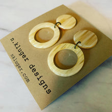 $15.00 USD$0.00 USDAvailable: In stockHandmade acrylic laser-cut creamy yellow double circle drop earrings, iron posts, push-back closure. Antique gold connectors. Size: 21mm top circle, 29mm bottom open circle. 53mm total length. Nickel-free.