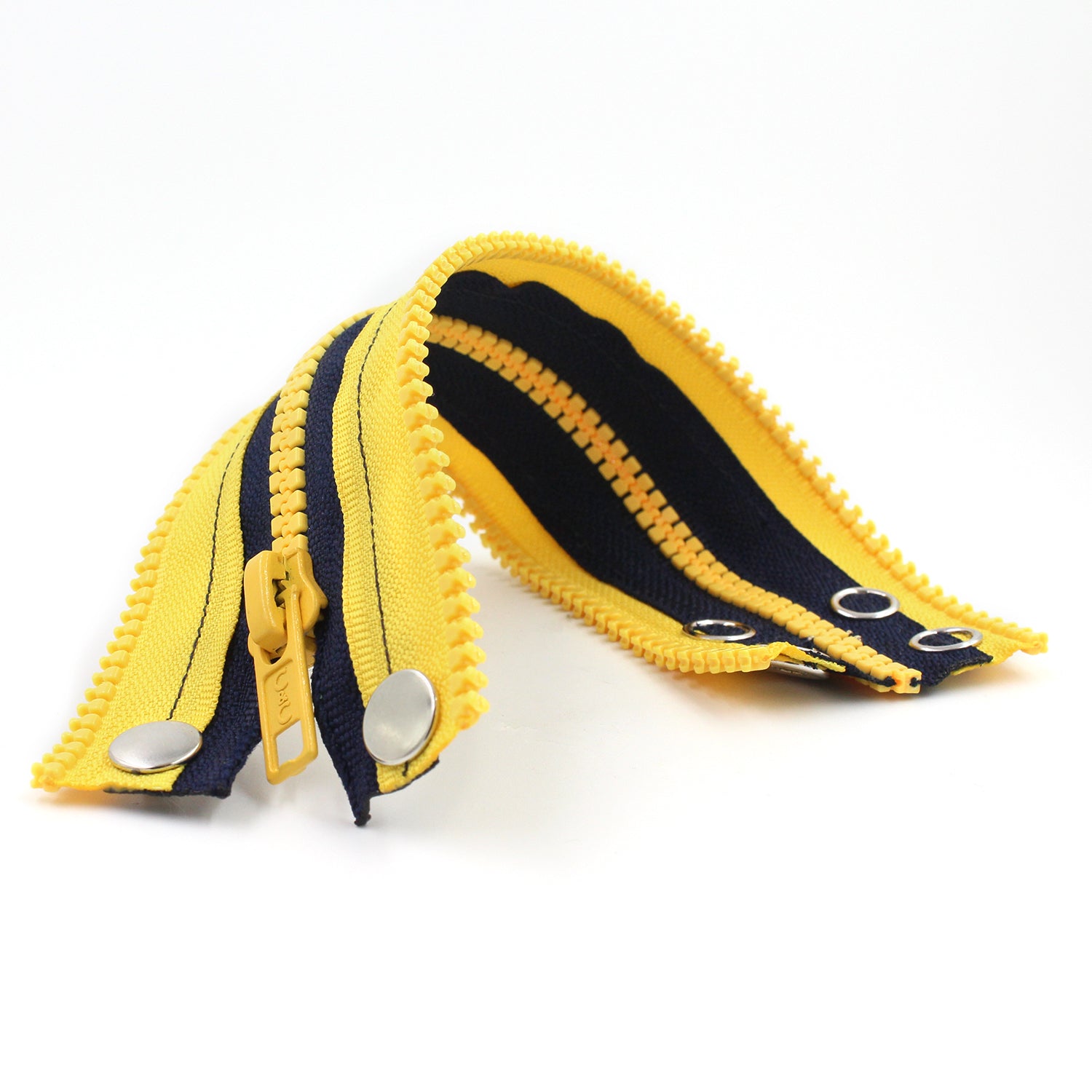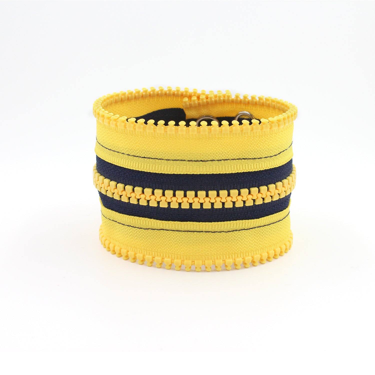 $20.00 USD$0.00 USDAvailable: In stockYellow & Navy combined scream "college/team/business colors" zipper bracelet. Navy blue inner zipper with yellow teeth. Yellow outer zipper with yellow teeth. Navy blue topstitch. Nickel snaps. Yellow classic zipper pull. Bracelet width: 1.75" Size: Adjustable 2 ways - 7.5" and 8.25" (Medium to Large)