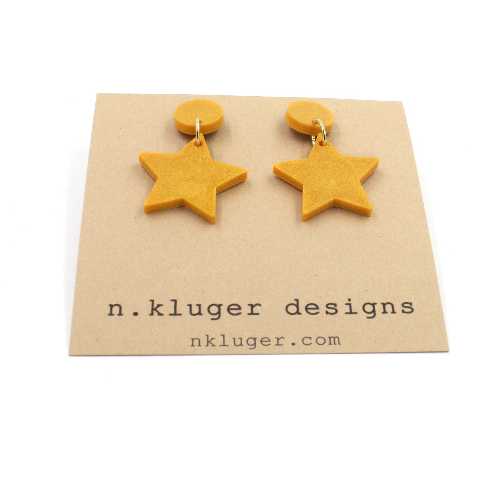 $15.00 USD$0.00 USDAvailable: Out Of Stock :-(100% Handmade shimmering matte gold resin star drop earrings on stainless steel posts. Size: 1" at widest point, 1.5" total length Copper earrings not included. Nickel-free