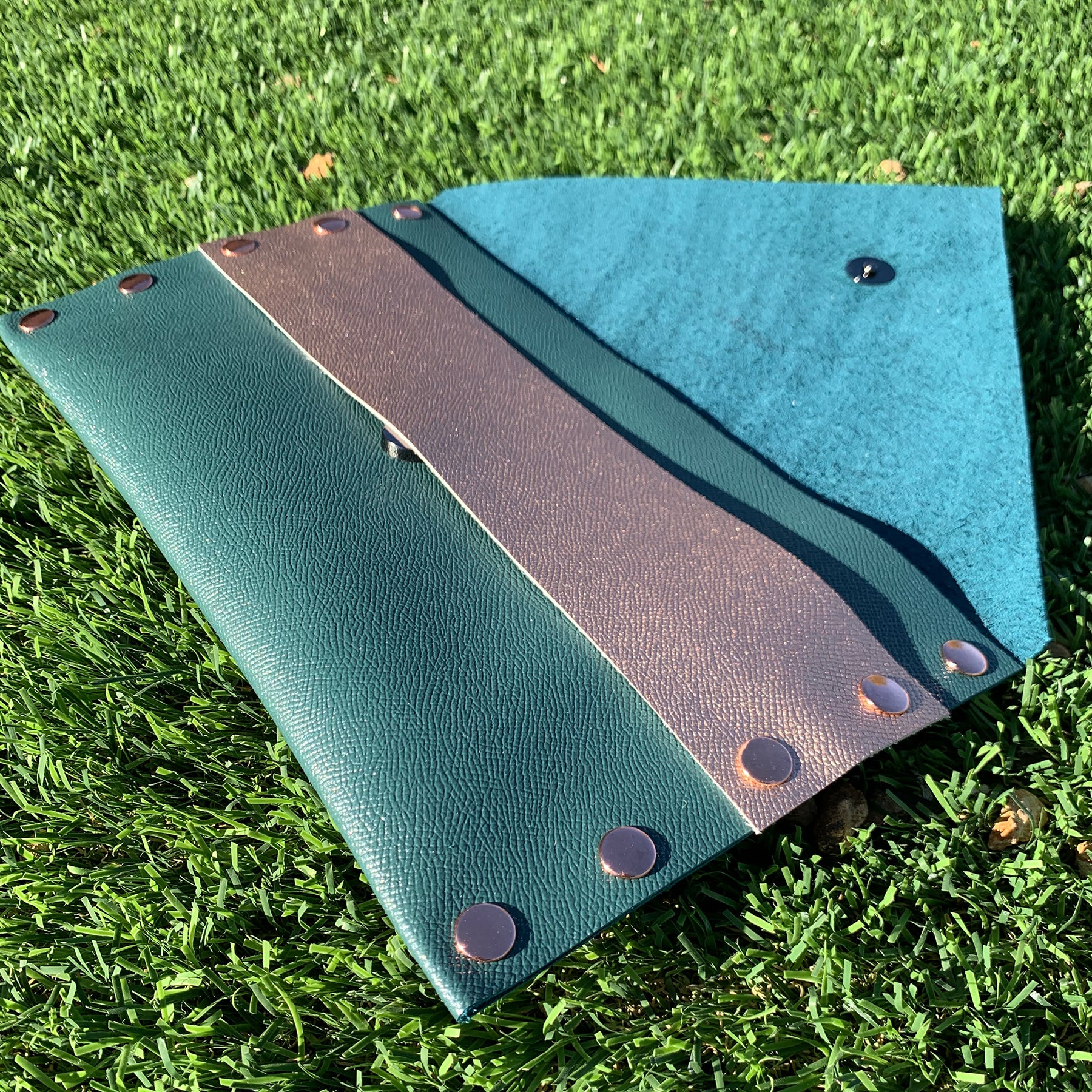 Metallic Teal Leather Envelope Clutch with Rose Gold Strap