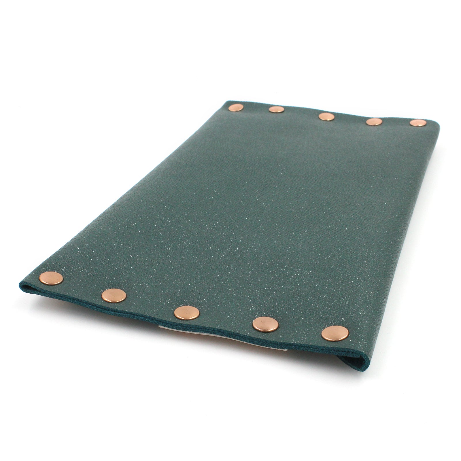 $85.00 USD$0.00 USDAvailable: Out Of Stock :-(Handmade genuine leather envelope clutch. Stunning glittery metallic teal leather with glittery rose gold leather hand strap. Polished copper rivets and gunmetal magnetic snap closure. Measurements:12.25" width x 6.75" height Teal interior. Rose gold matching mini wallet not included.
