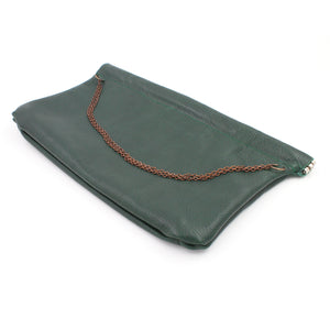 Dark green super soft genuine leather snap frame clutch with rose gold chain attachment on one side.