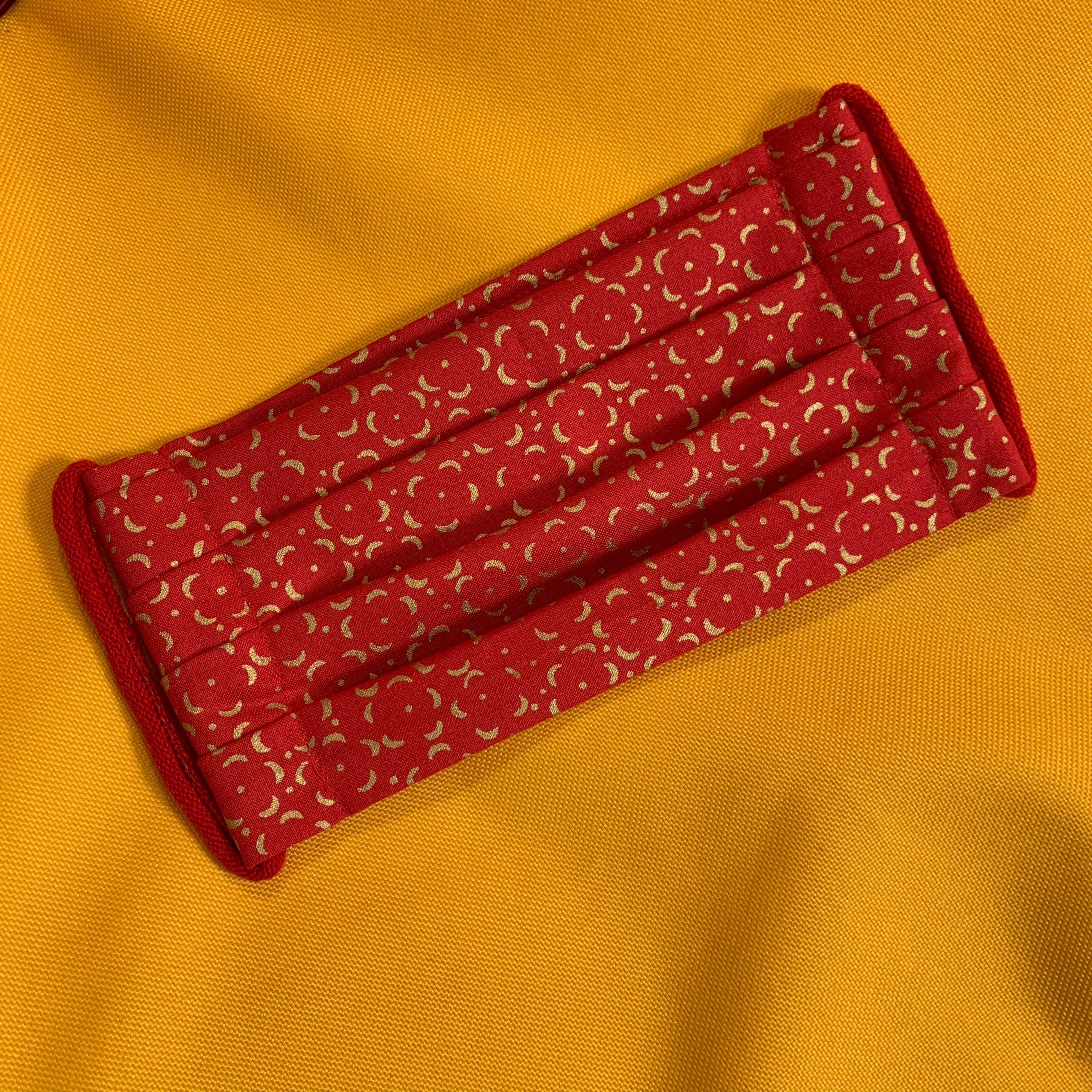 Reusable and washable, 100% breathable cotton face mask in a gorgeous fire engine red with gold filigree abstract flower pattern. These are also reversible.