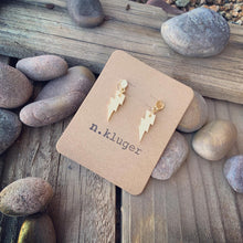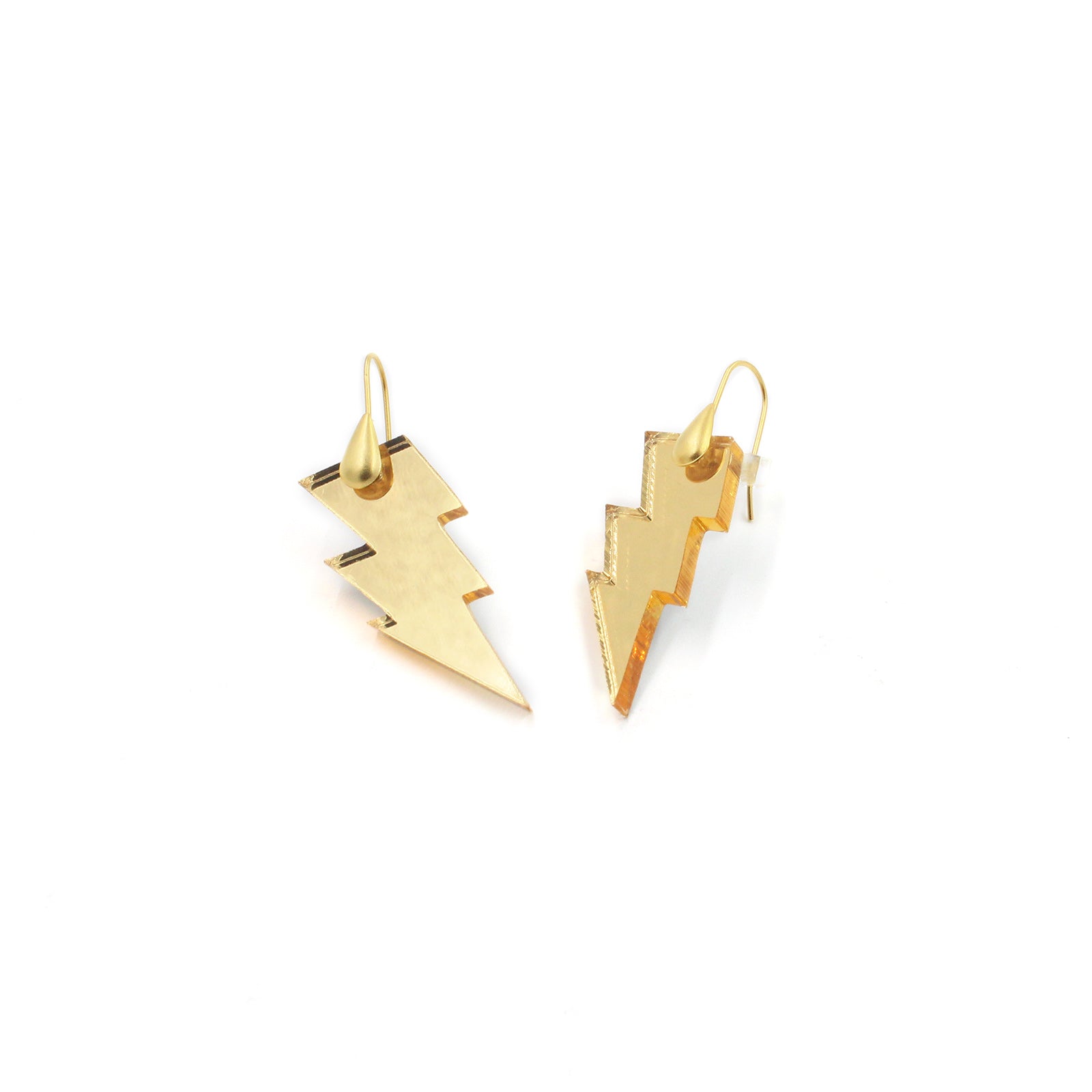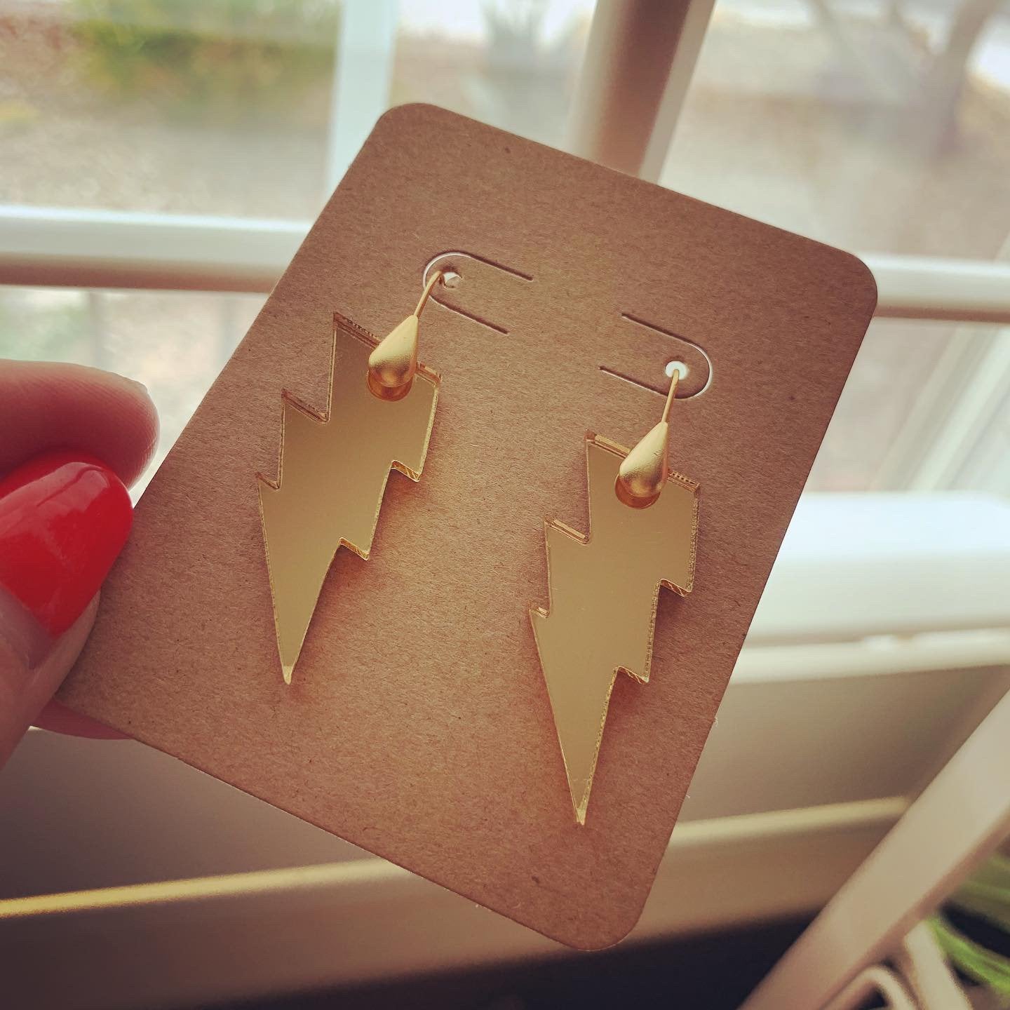 $12.00 USD$0.00 USDAvailable: Out Of Stock :-(Handmade miniature acrylic laser-cut gold mirror lightning bolt drop earrings on gold-plated earring posts. Gold-plated over alloy posts. Size: 1.25" long drop, less than 1/2" width