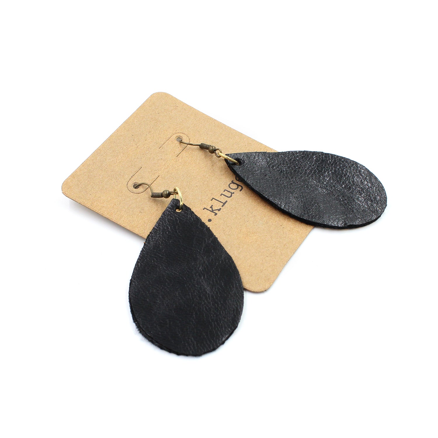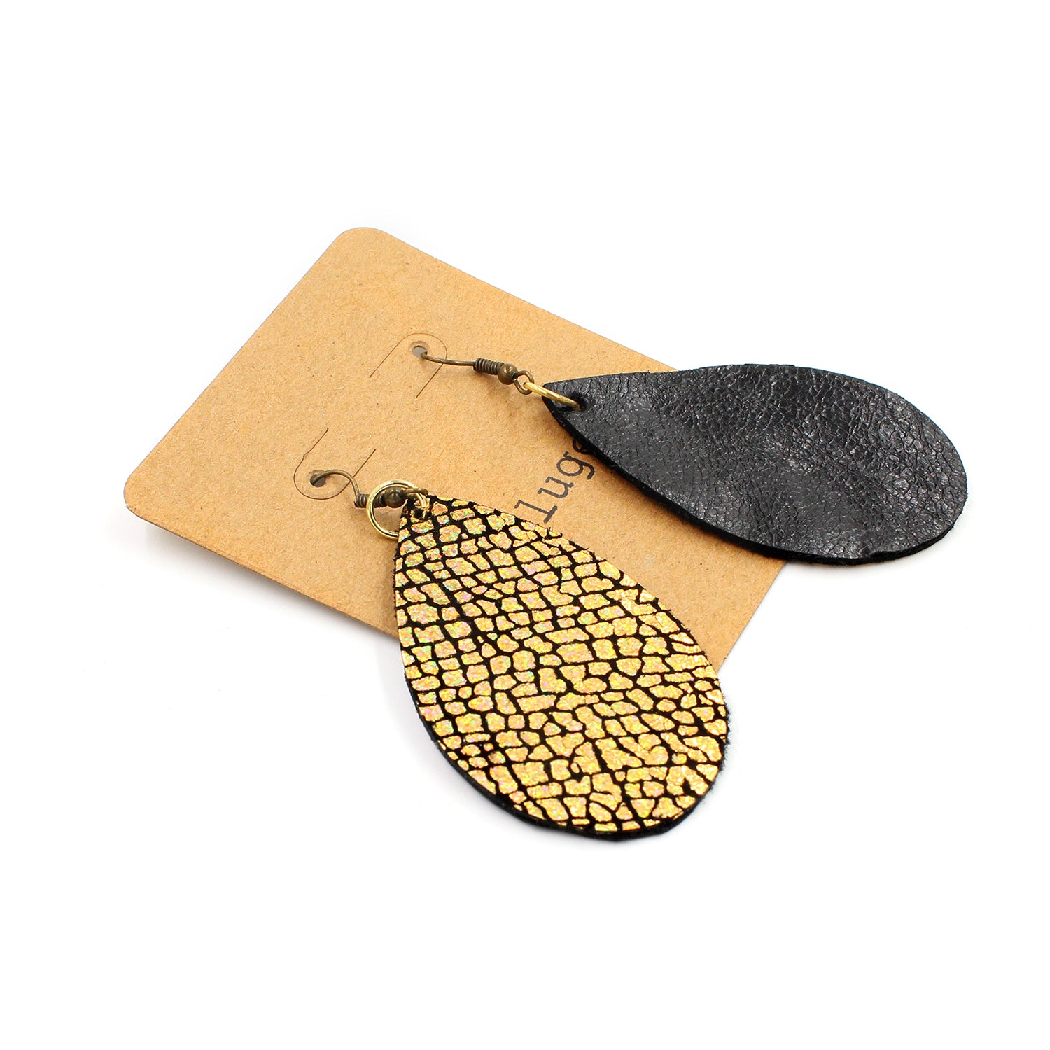$20.00 USD$0.00 USDAvailable: In stockHandmade drop earrings with shiny black leather with gold mermaid leather backside. Nickel-free iron posts. Size: 3" total drop. 1.5" width at widest point.