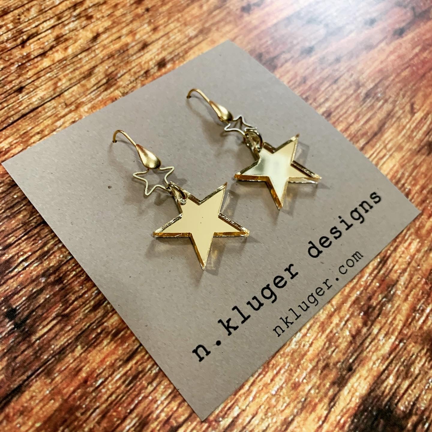 $12.00 USD$0.00 USDAvailable: Out Of Stock :-(Handmade miniature acrylic laser-cut gold mirrored star drop earrings on nickel-free earring wires. Size: 25mm width, 40mm total drop