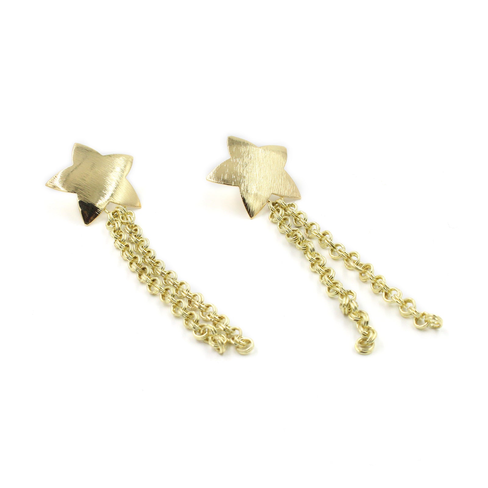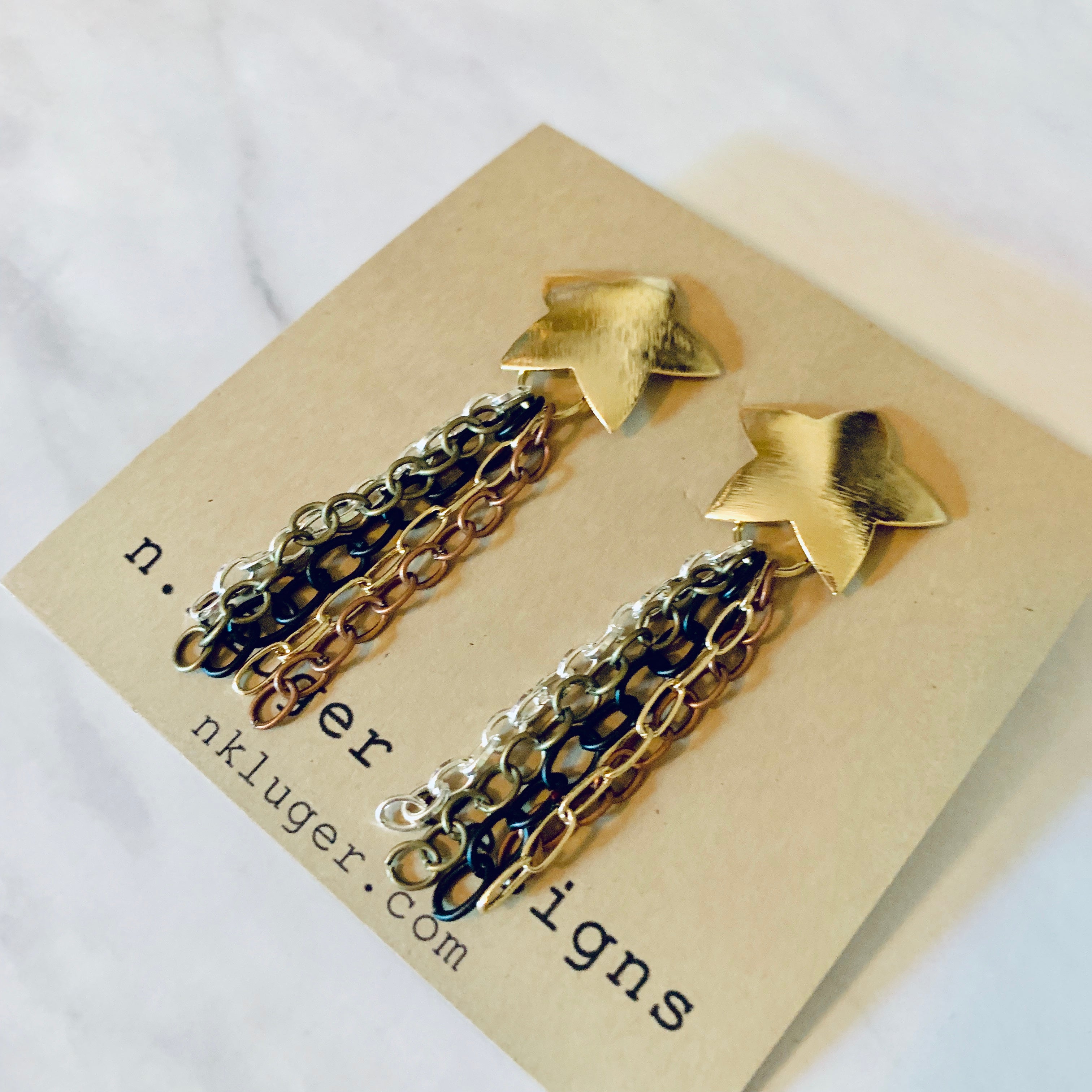 $20.00 USD$0.00 USDAvailable: In stockHandmade dangling shooting star earrings, with large brass curved star and chain detail push-back steel closure. Nickel-freeLead-freeCadmium-free Size: 23mm wide and 75mm in total length (almost 3").