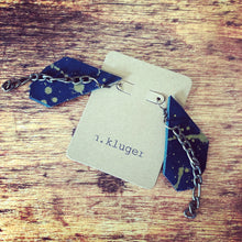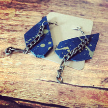 $25.00 USD$0.00 USDAvailable: Out Of Stock :-(Very cool handmade abstract shaped navy leather dangling earrings with hand-painted gold metallic splatter and brass chain accent. Nickel-free iron posts. Size: 2.5" long. 1.5" width at widest point.