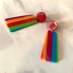 Handmade acrylic laser-cut rainbow striped dangling earrings with red plastic and stainless steel pushback closures.