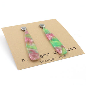 Handmade acrylic laser-cut green and pink leaf pattern drop earrings stainless steel posts with push-back closure.