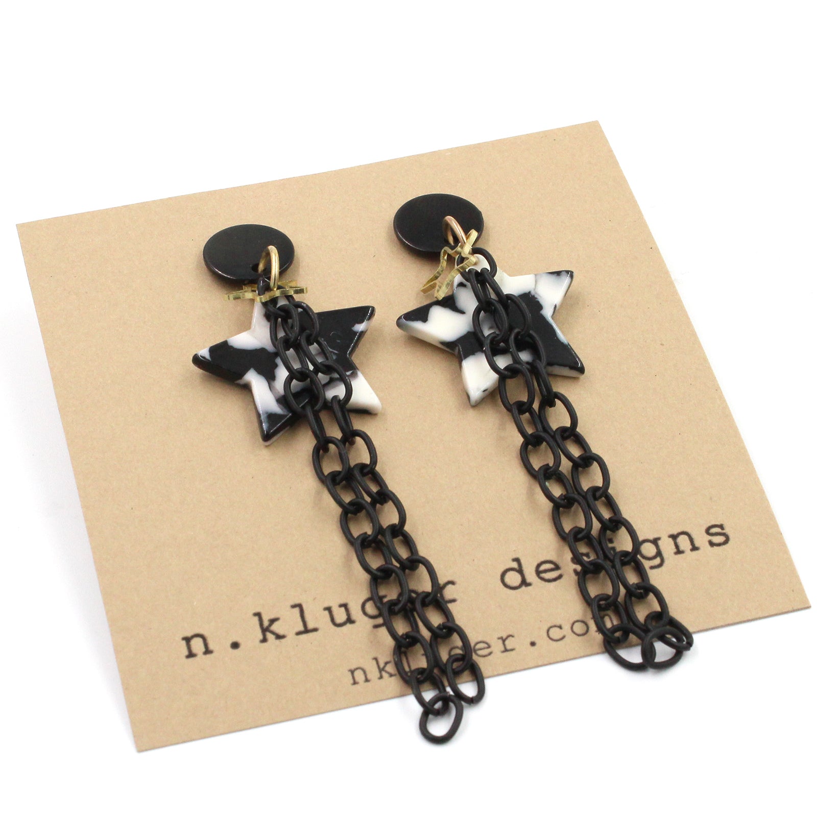 $20.00 USD$0.00 USDAvailable: In stockHandmade acrylic laser-cut black and white mosaic stars dangle earrings with gold stars layered on top, black stainless steel push back closures. Nickel-free. Size: 25mm width at widest point and 80mm total drop length.