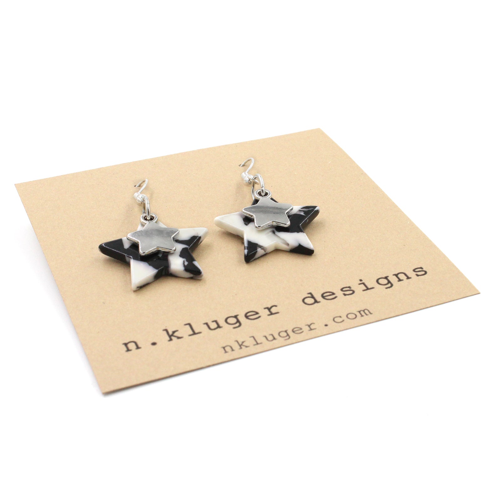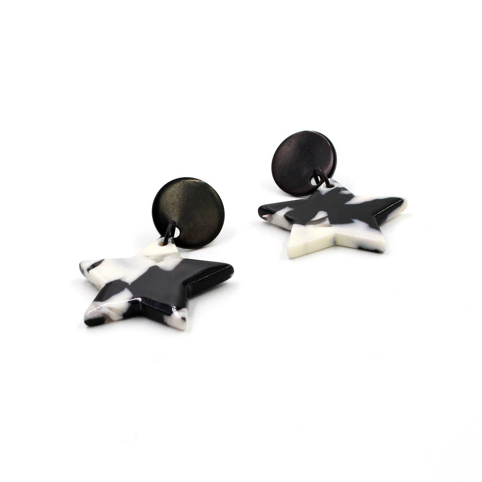 $15.00 USD$0.00 USDAvailable: In stockHandmade acrylic laser-cut black and white mosaic stars dangle earrings with steel stars layered on top, iron wire posts. Nickel-free. Size: 25mm width at widest point and 40mm drop length.