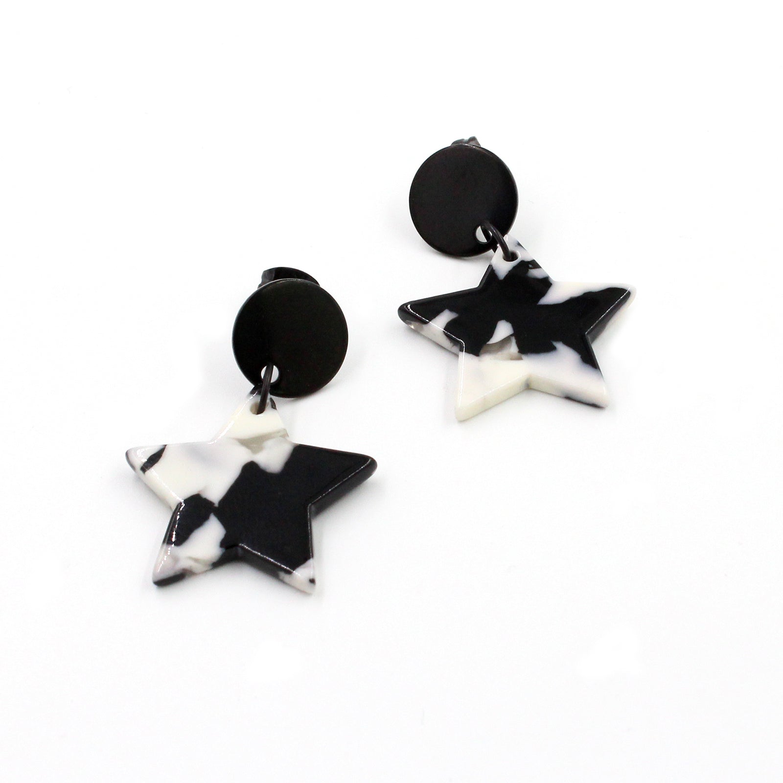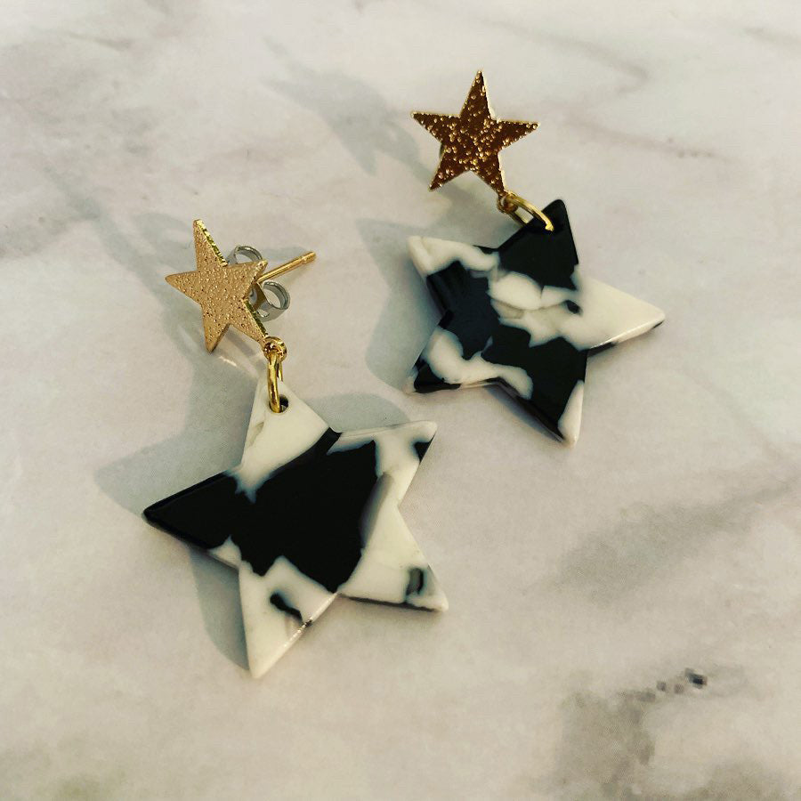 Black , White & Gold Acrylic Stars Dangling Earrings