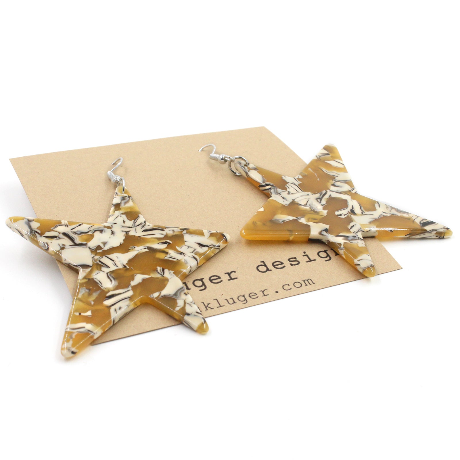 $15.00 USD$0.00 USDAvailable: In stockHandmade acrylic laser-cut extra large tortoise shell abstract star dangle earrings, iron wire posts. Nickel-free. Size: 63.5mm width at widest point and 88mm drop length.