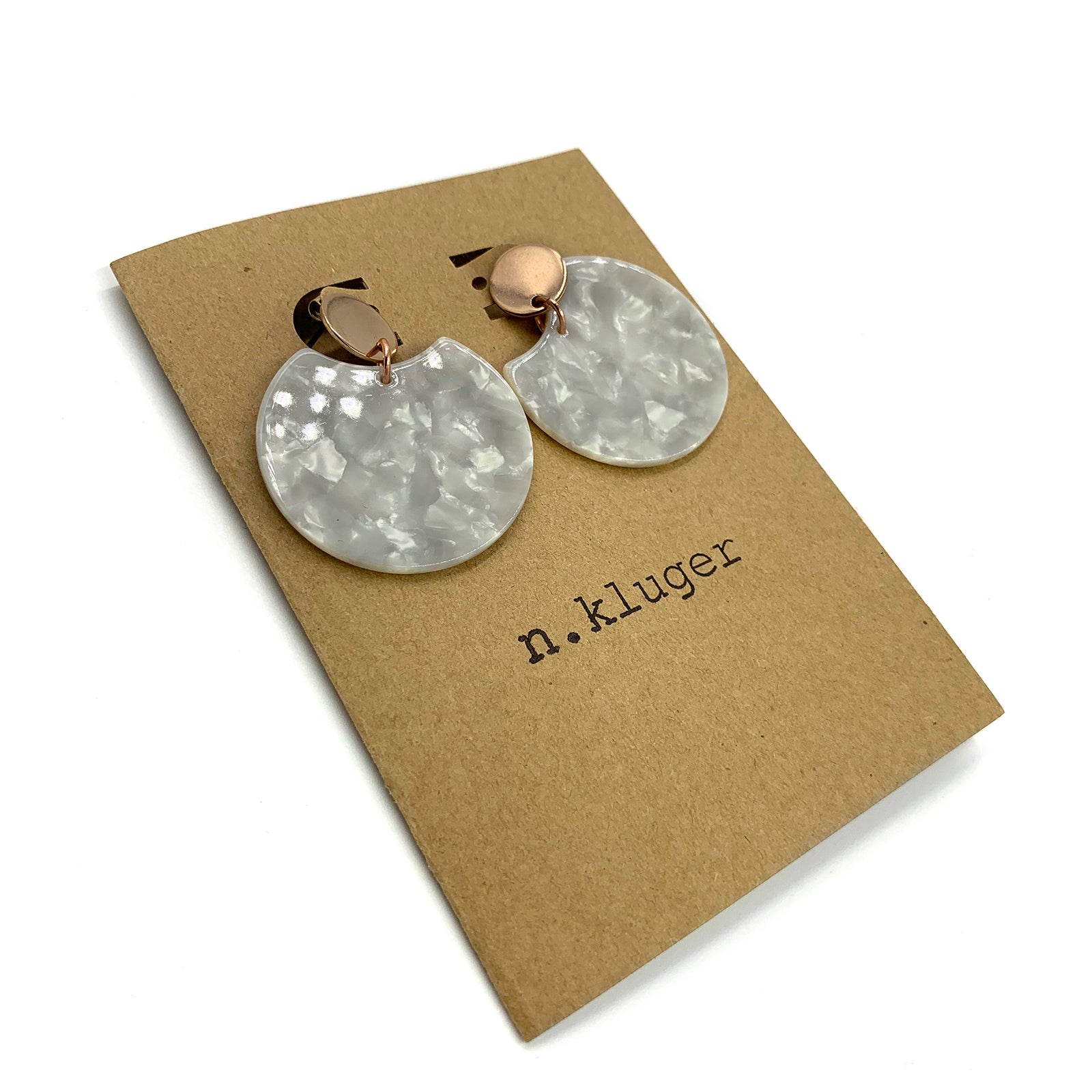 $15.00 USD$0.00 USDAvailable: In stockHandmade acrylic resin laser-cut white circle cut-out tortoise shell drop earrings, rose gold-plated stainless steel posts with butterfly push-back closure. Size: 36mm width (approximately 1.5") with a 1.5" drop.