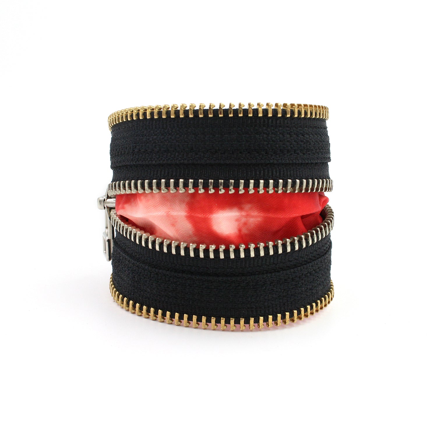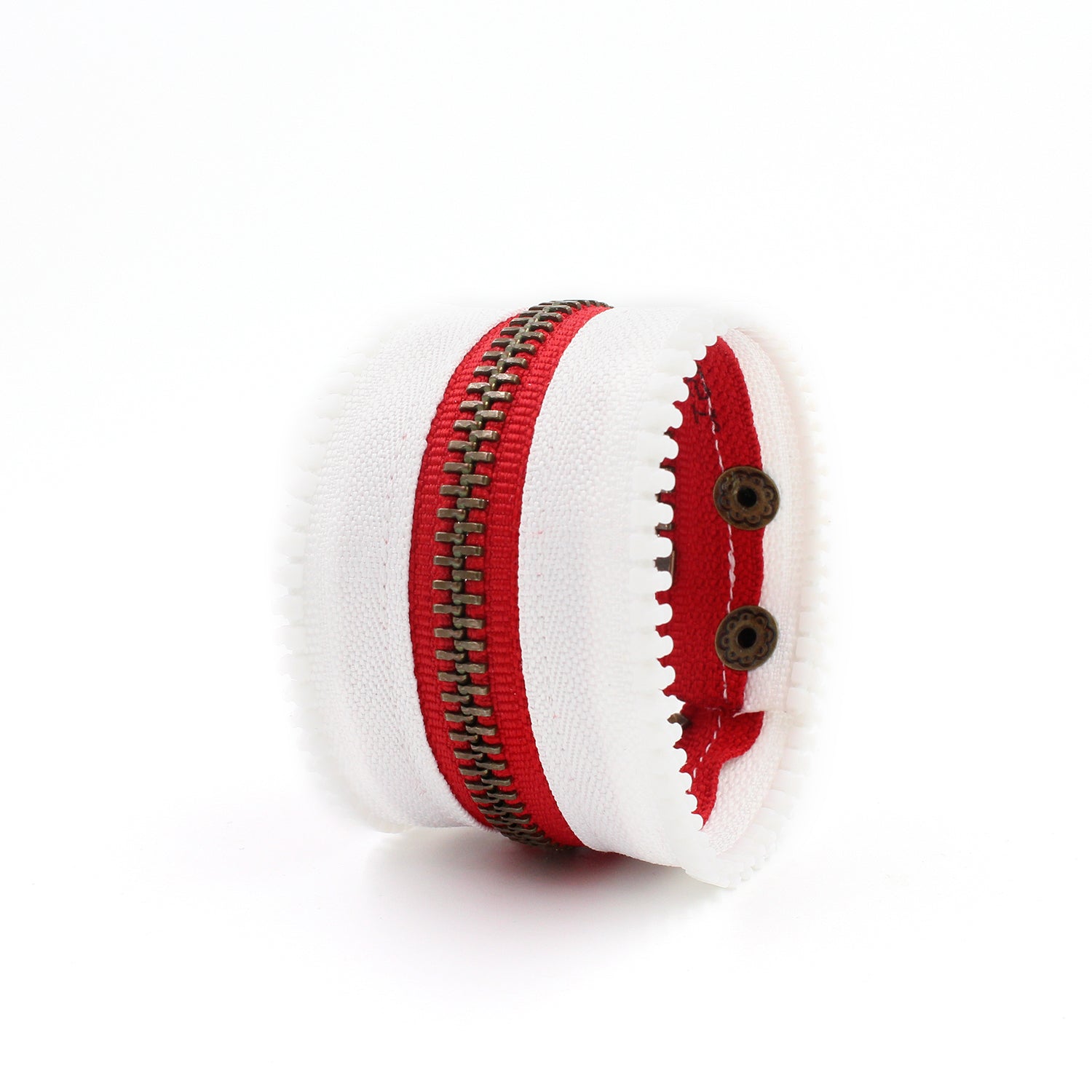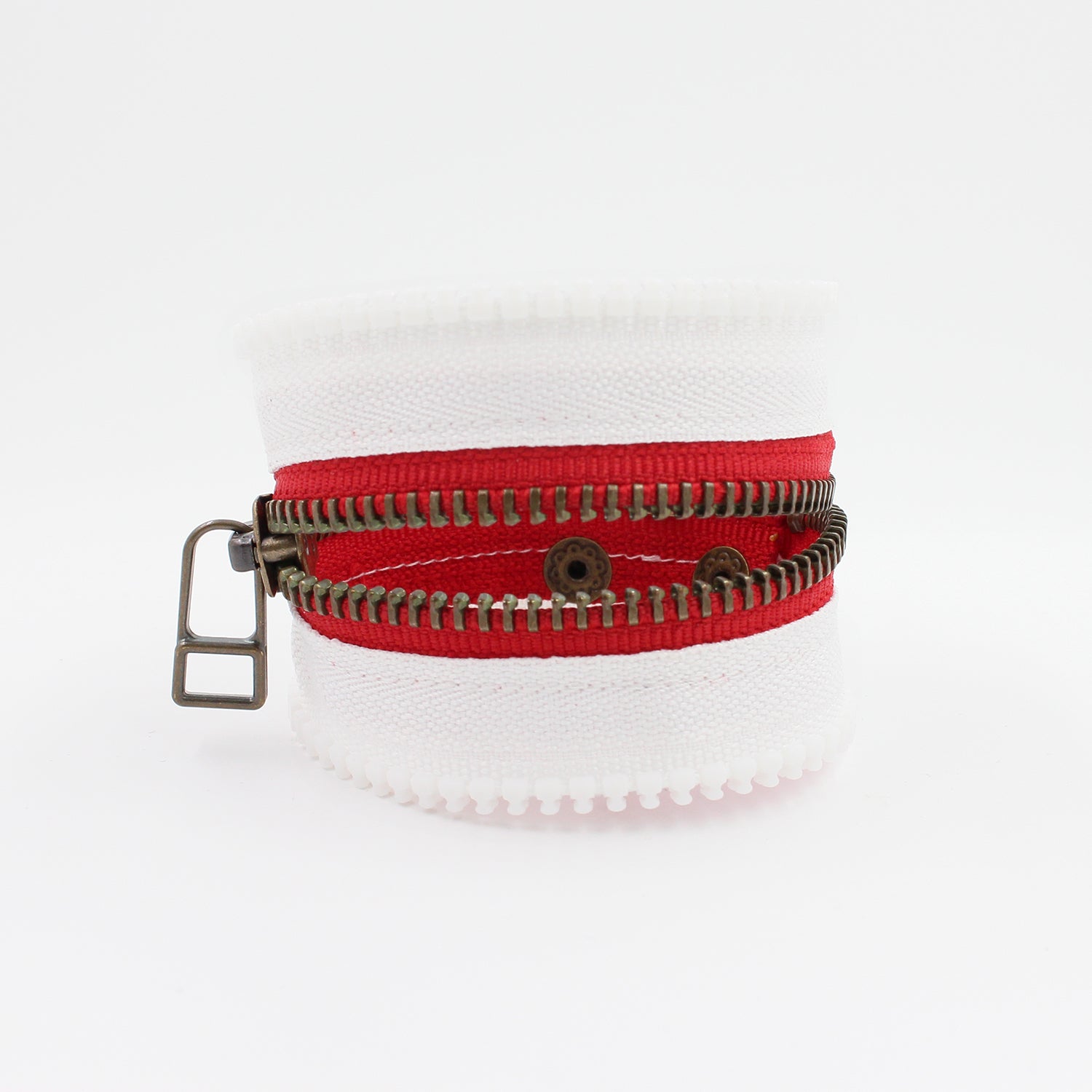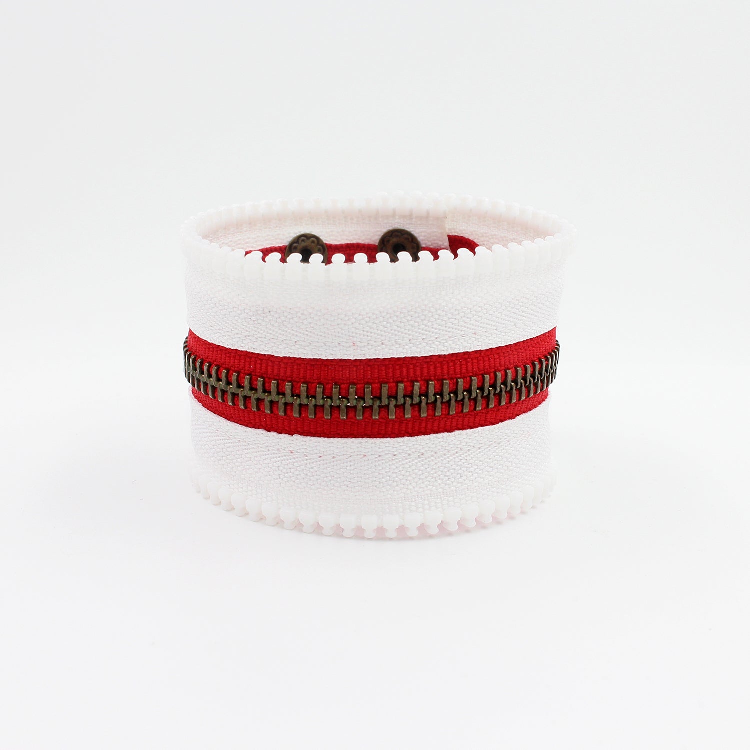 $20.00 USD$0.00 USDAvailable: In stockUnderstated love zipper bracelet. Red inner zipper with antique gold teeth. White outer zipper with white teeth. White topstitch. Antique gold snaps. Antique gold zipper pull. Bracelet width: 1.75" Size: Adjustable 2 ways, 6 3/4" and 7.5" (Small to Medium/Large)