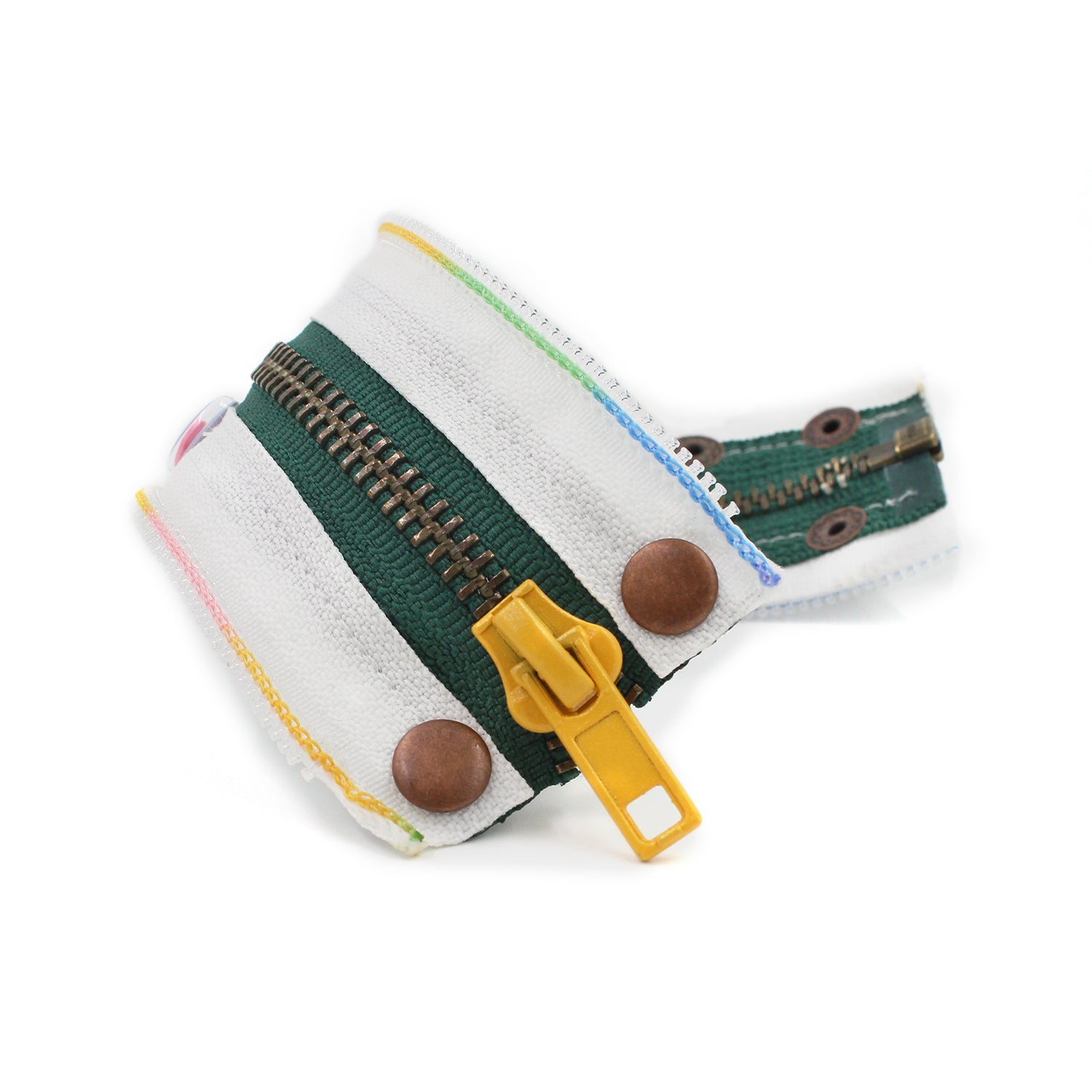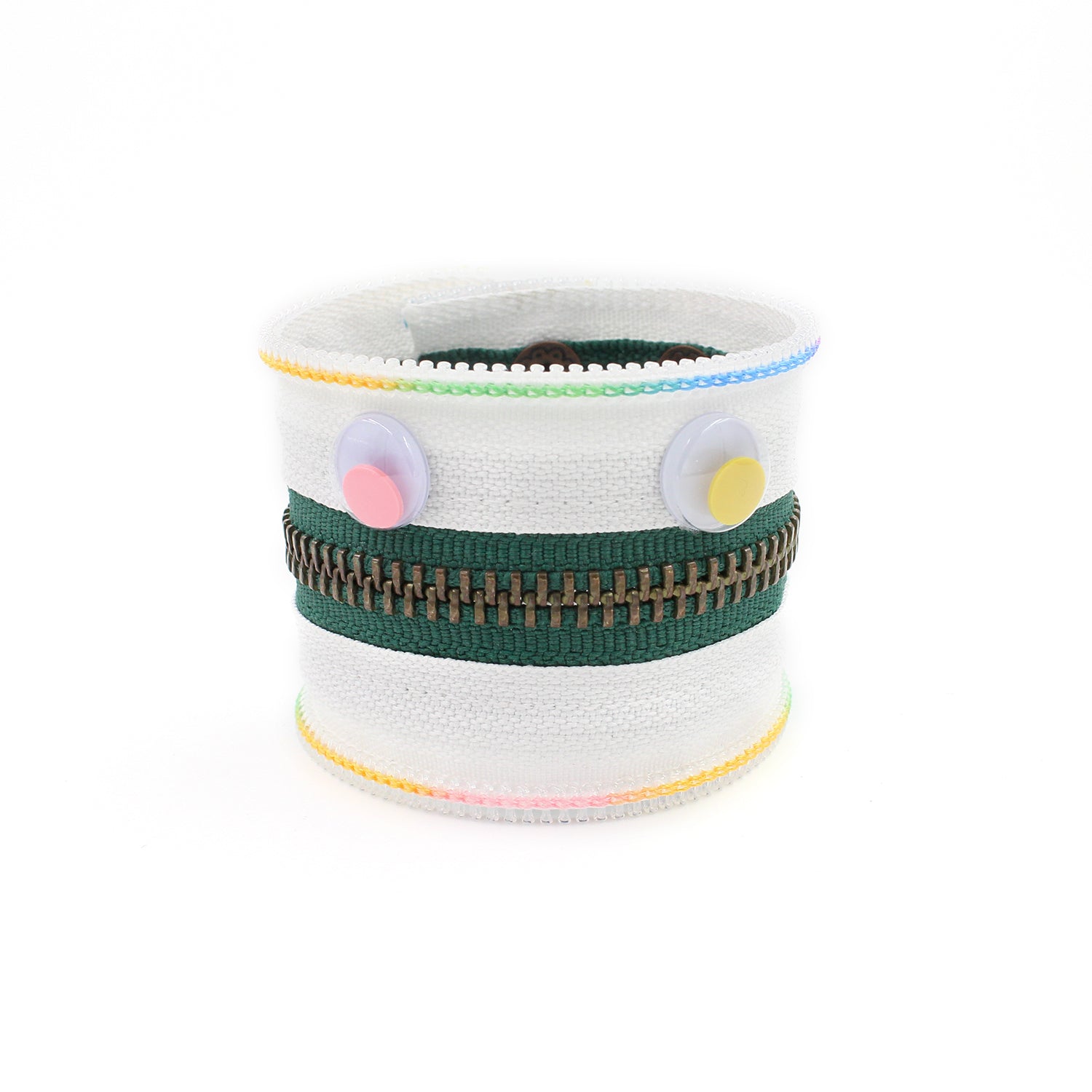 $25.00 USD$0.00 USDAvailable: In stockIntroducing the fun and whimsical "Monster" zipper bracelets! Dark Green/Teal inner zipper with antique gold teeth. White outer zipper with rainbow teeth. White topstitch. Copper snaps. Pink and Yellow Monster Eyes. Yellow/Orange classic zipper pull. Bracelet width: 1.75" Size: Adjustable 2-ways, 6" and 6.75" (Small)