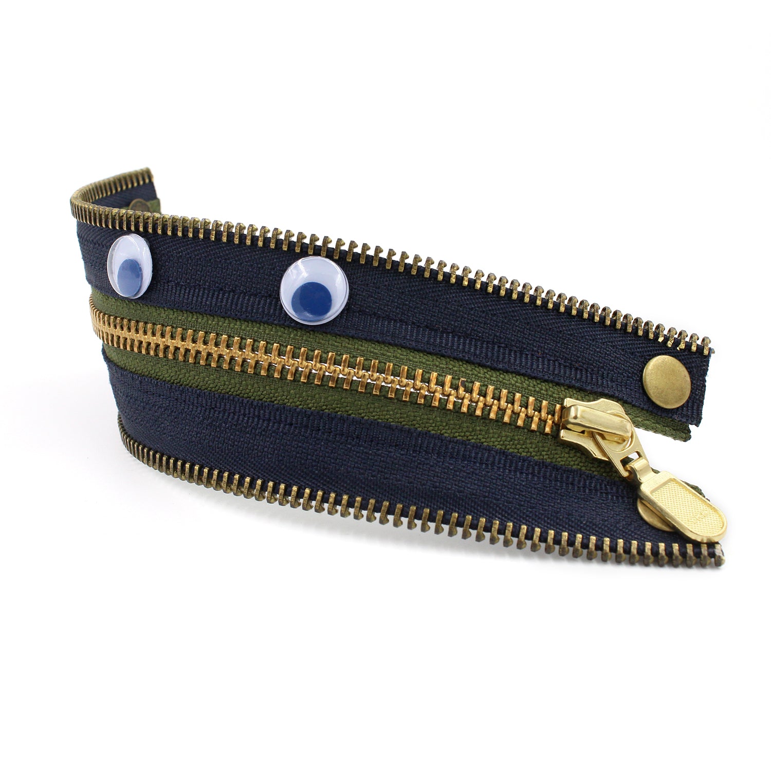 $25.00 USD$0.00 USDAvailable: In stockIntroducing the fun and whimsical "Monster" zipper bracelets! Olive green inner zipper with antique gold teeth. Navy blue outer zipper with antique gold teeth. Navy blue topstitch. Antique gold snaps. Blue Monster Eyes. Brass zipper pull. Bracelet width: 1.75" Size: Adjustable two ways, 6.25" and 6.75" (Small)