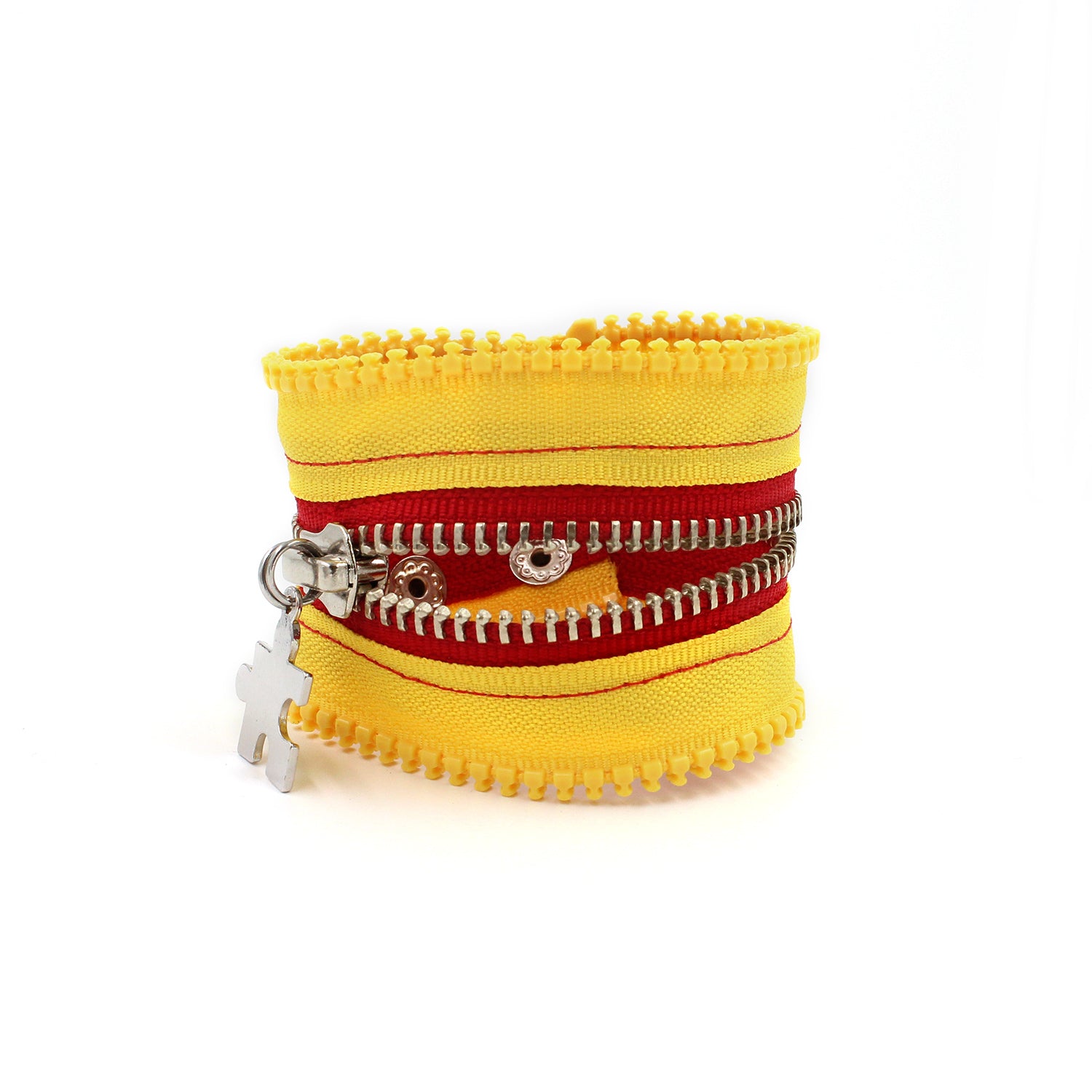 $20.00 USD$0.00 USDAvailable: In stockZipper bracelet that is beach-ready! Electric purple inner zipper with brass teeth. Light neon yellow outer zipper with nickel teeth. Yellow topstitch. Gunmetal snaps. Brass classic zipper pull. Bracelet width: 1.75" Size: Adjustable two ways, 6.75" and 7.5" (Small/Medium/Large)